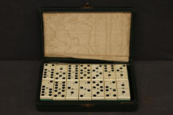 Vintage Domino Set in Green Box With David L. Spanel Engraving. Includes a full set of white-and-black dominos with a green trim, housed in a green carrying case. The case is engraved with the name 'David L. Spanel' and features a latch closure. Pickup only.