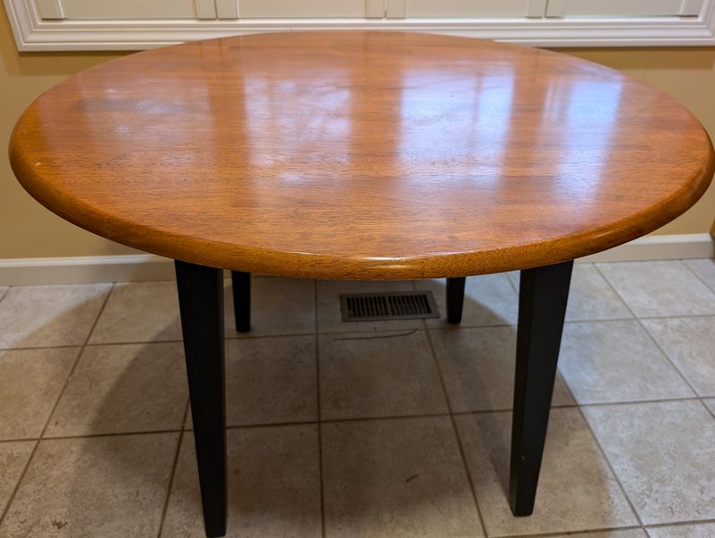 Five-Piece Dinette Set. Cherry & black painted dinette set by Amesbury furniture: table, 41"diam x 30"H; set of four side chairs, ea. 17"Wx17"Dx36.5"H; set of four blue seat cushions.