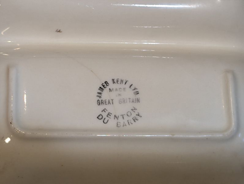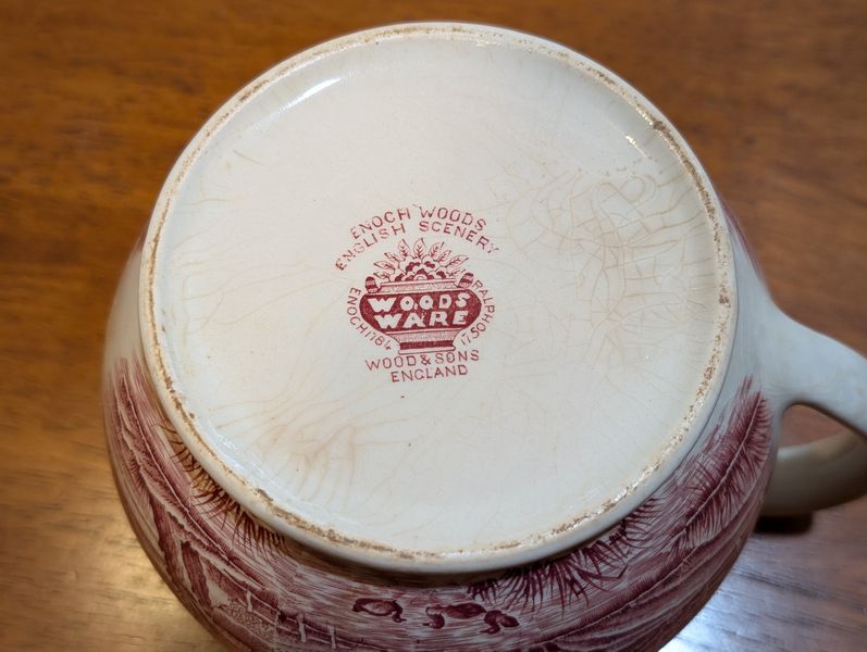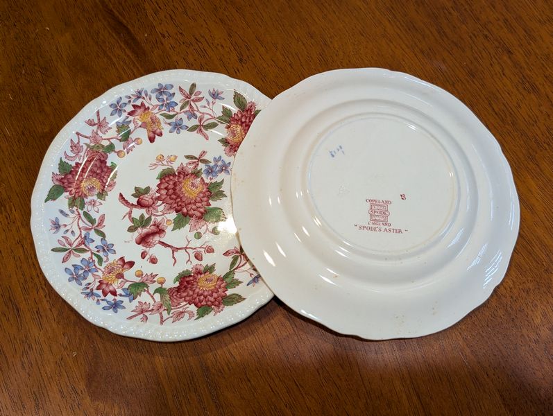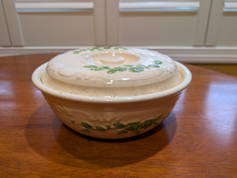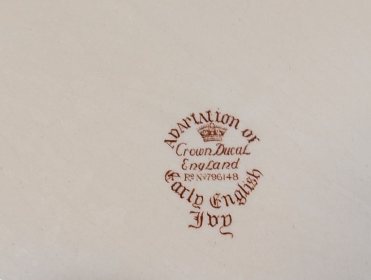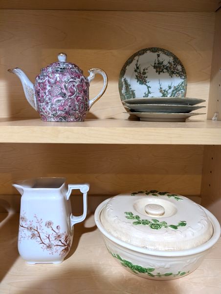 Corning Cookware and Entertaining. Eight pieces Corning cookware; oval English platter, 16"L; Spode seven-piece dish set with 13" platter & set of six matching dessert plates; vintage covered casserole (US Pottery maker), 9"diam; antique pitcher by Wood & Sons, England "Enoch Woods"; other pieces (English, German, Great Britain - see maker's marks); other related items as seen in cabinet & on counter below.