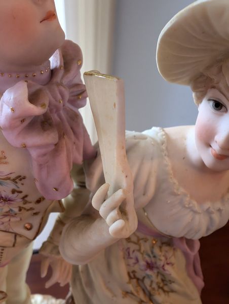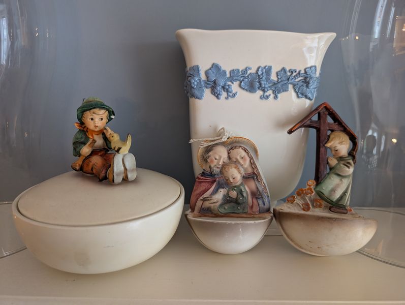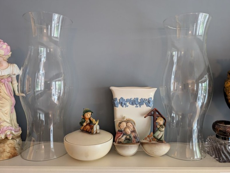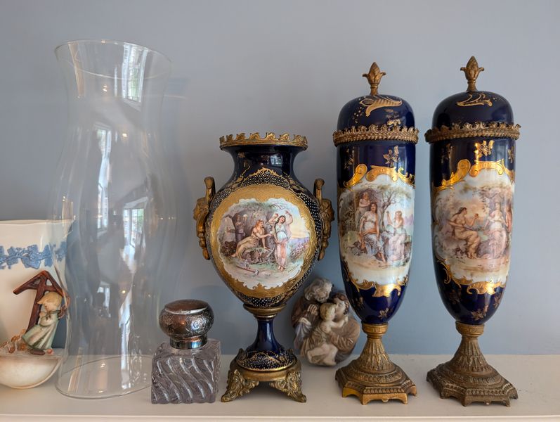 Quality Vintage Décor, featuring Wedgwood. Fourteen items: Victorian statue, 14"H (see photo missing tip of finger); Wedgewood vase, 8"H; Wedgwood covered dish; pair of extra tall clear glass hurricane globes; Hummel covered bowl; Hummel wall plate; antique silver topped bottle; set of three cobalt blue Victorian vessels (two with lids). See photos for more details.