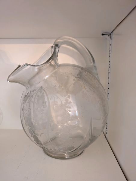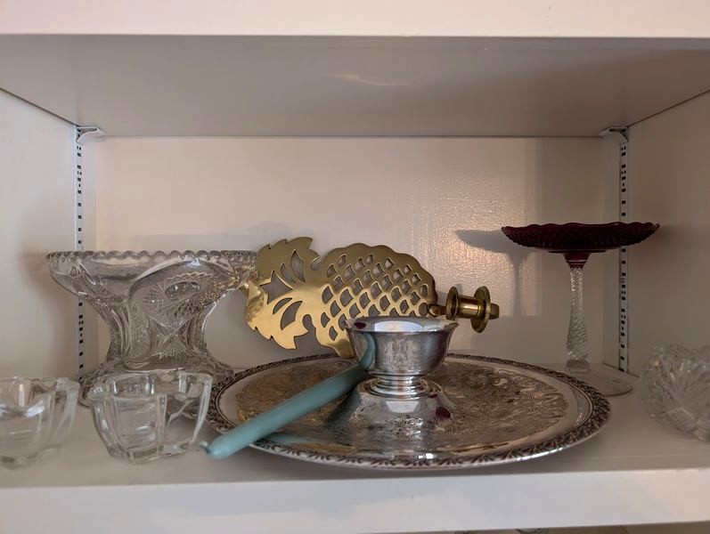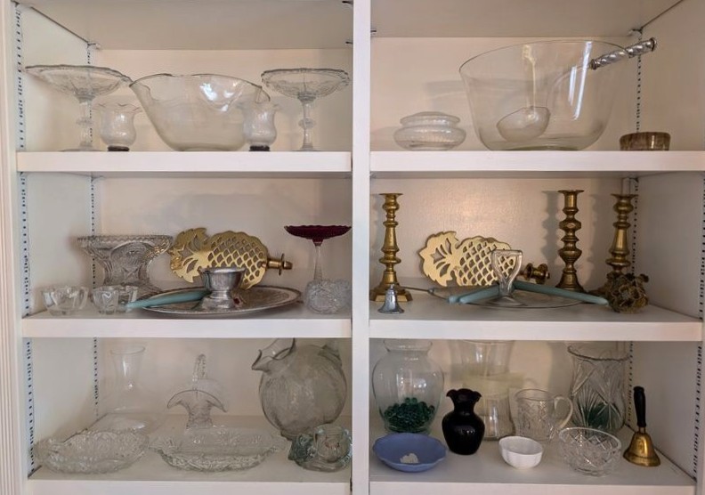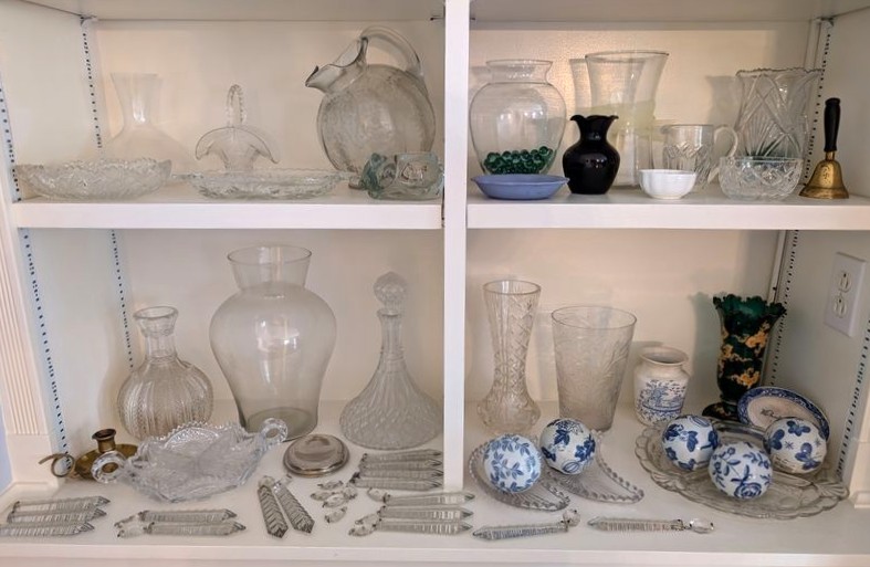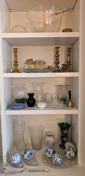 Crystal and Brass Entertaining. Over seventy pieces: three brass candlestick holders, ea. approx. 8"H ; vintage punchbowl, approx. 11"diam with glass & silver plated handle; pair of brass "pineapple" wall mount candle holders; multiple vintage glass entertaining pieces, including bowls, platters, pitcher, vases, decanter; chandelier crystals (approx. 16); other related items as seen in photos.