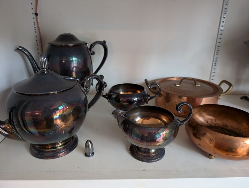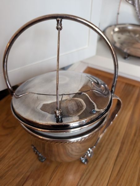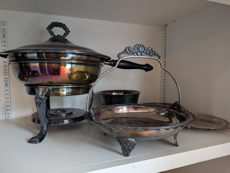 Vintage Silverplate and Copper Entertaining. Silverplate including coffee/tea service (note coffee finial detached); covered buffet warming dish; assorted platters, largest 13"L; covered ice bucket by Bristol Silverplate with tong;, punch bowl label; meat serv dish; serv utensils; trivets. See photos for more details.