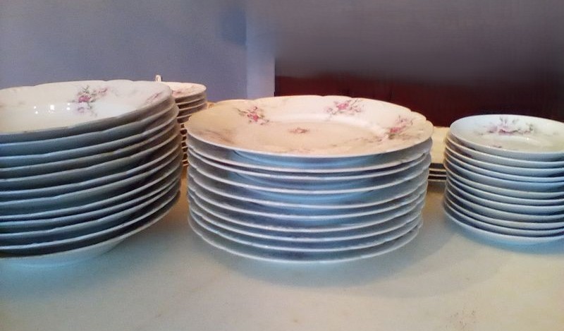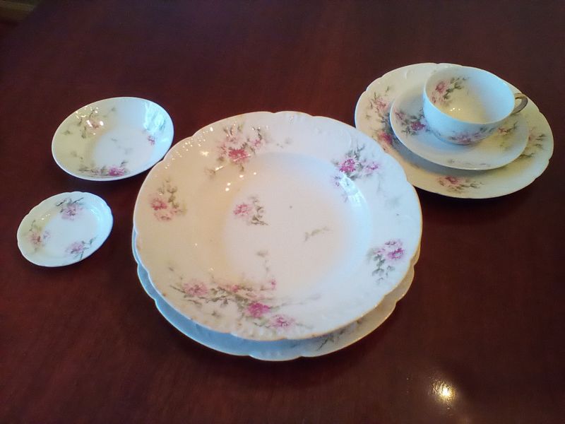 Haviland Limoges Dish Set. Seven-piece Limoges dish set (dinner, 10"; soup, 9.5") service of 12 (incomplete); covered casserole, approx. 1'L; two veggie bowls, approx. 9.5"L; gravy boat with plate. Over 70 pieces. Matches serving pieces in lot #18.