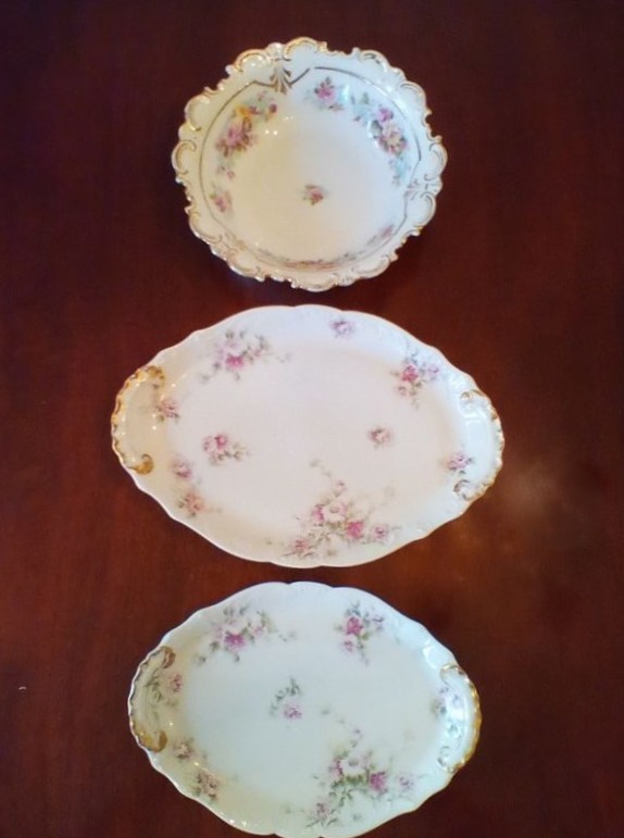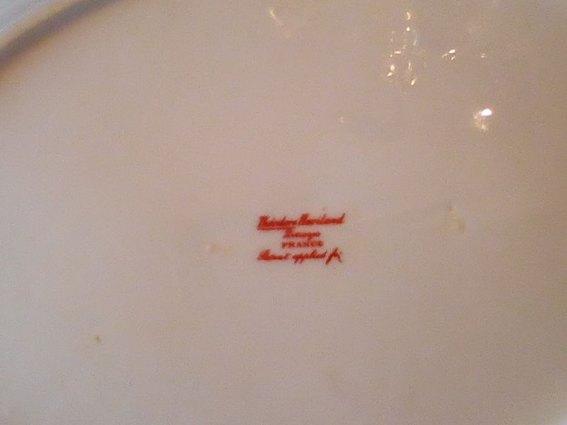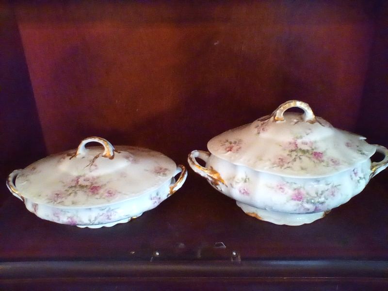 Haviland Limoges Serving Pieces and Bowl. Six pieces Limoges serving pieces, incl: oval double-handle large platter, 14"L; smaller double-handle platter; covered tureen (no ladle), 13"L; covered vegetable dish, 10"L; coordinating scalloped bowl. Matches items in lot #17.