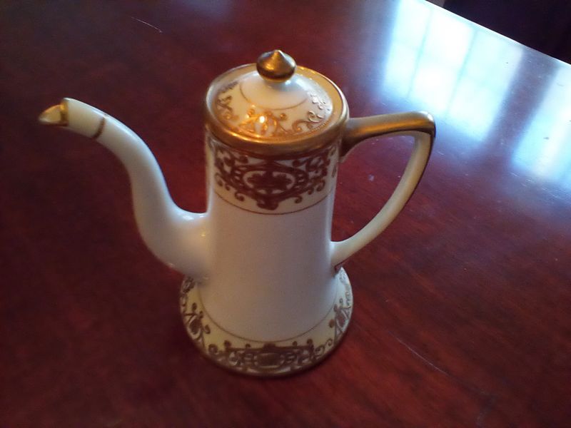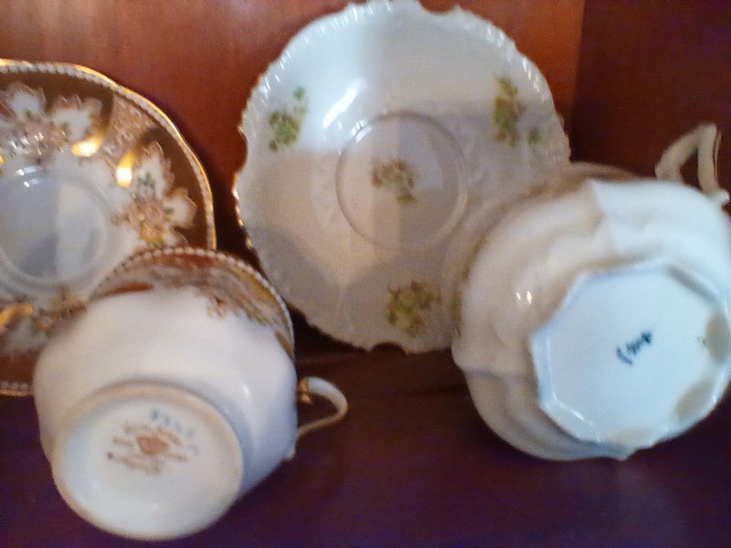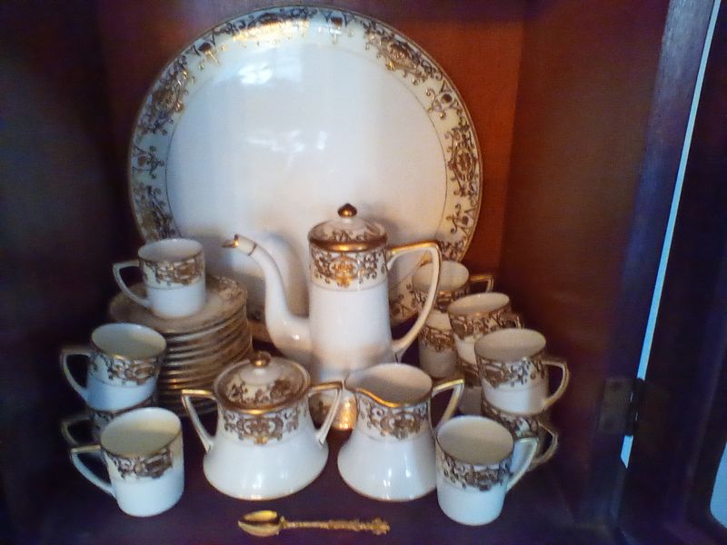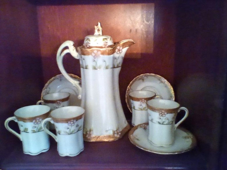 Vintage Porcelain Entertaining, featuring Two Hot Chocolate Sets. Ten-piece Nippon hot chocolate serv set, hand painted with gold: choc pot, 9"H; second hot choc set (over two dozen pieces) with smaller choc pot, cup & saucer, large serving dish; two tea cups/saucer sets; three-piece rose-motif footed bowls (large & small) w plate; set of nine German plates. See maker's marks.