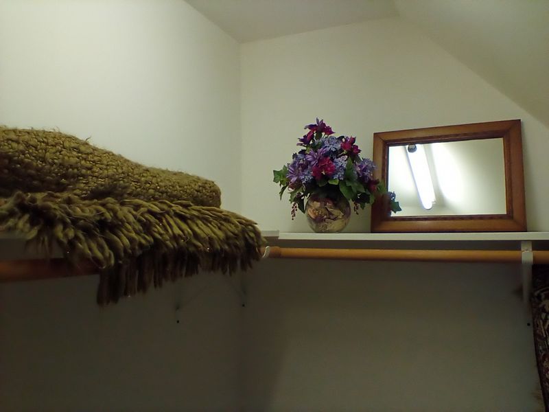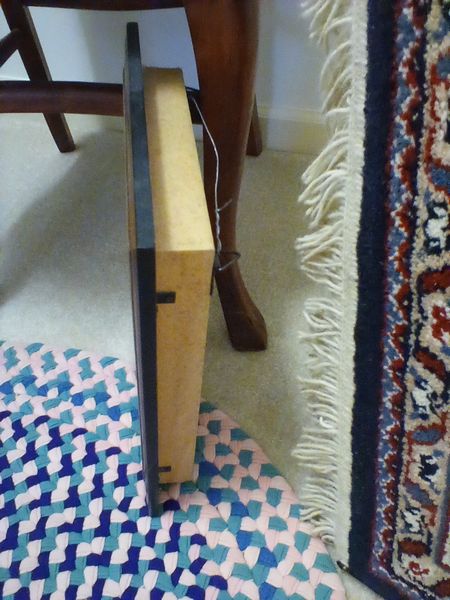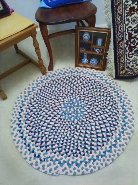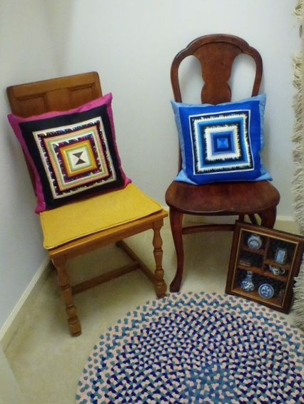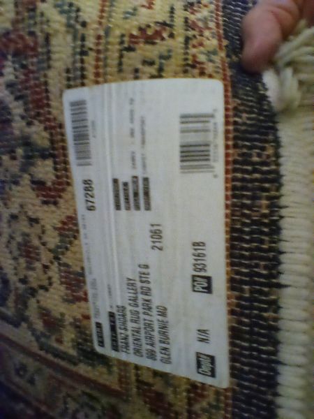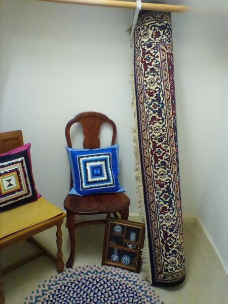 Small Furniture and Rugs. Two vintage wood side chairs; shadow box with blue & white collectibles; entry rug, 34"diam; large Oriental Rug Gallery fringed area rug (see label), approx. 5.5'x 8'; wood framed wall mirror, 16"x13"; two throw pillows; fringed throw blanket; artificial floral decor. Loc on 2nd fl.