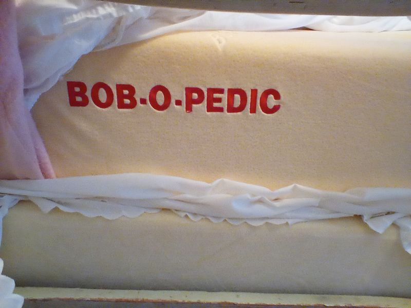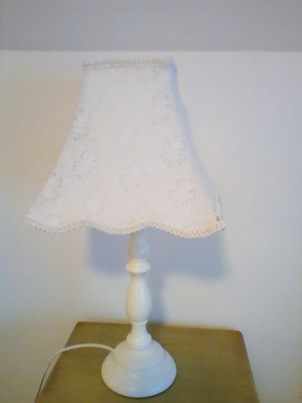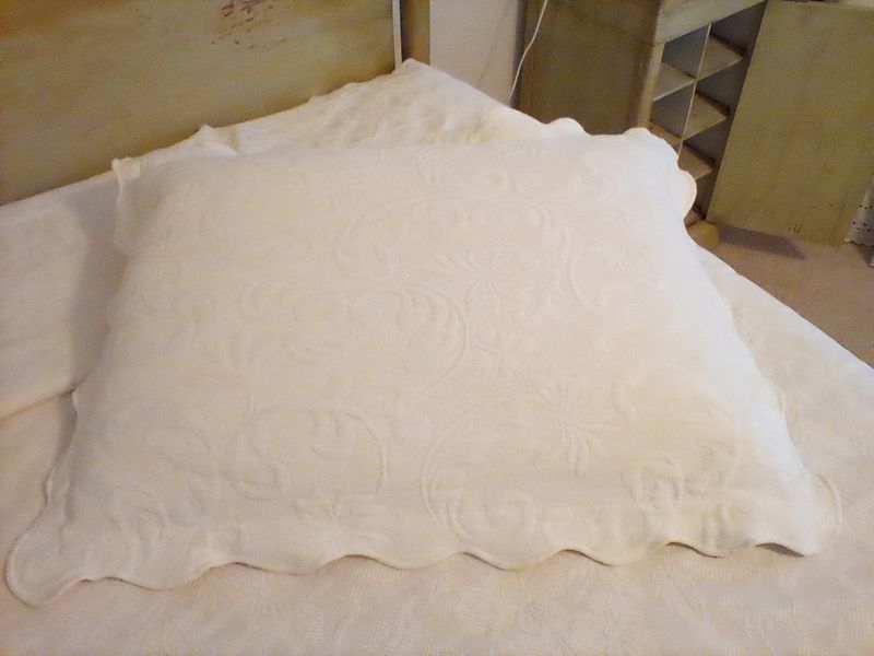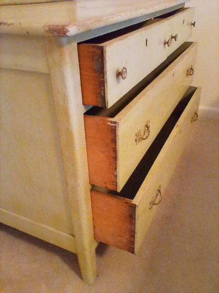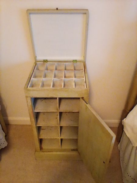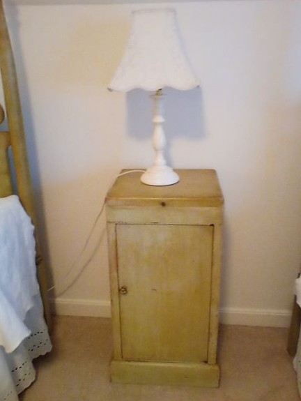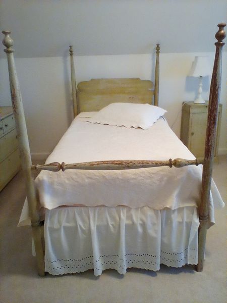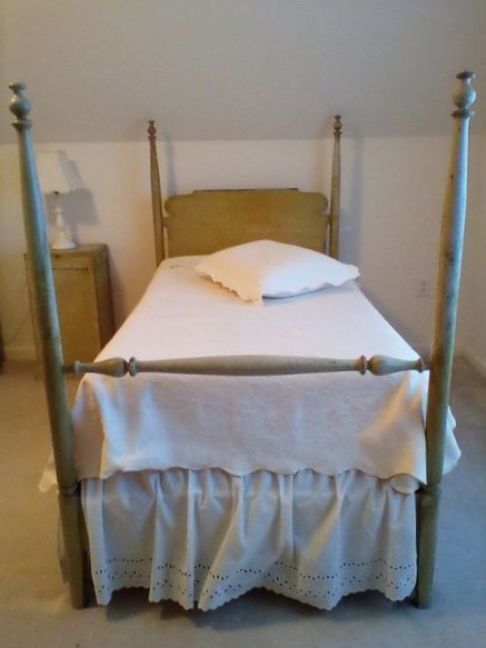 Green Painted Twin Bedroom Set. Pair of twin four-post beds, 58"H; matching four-drawer chest, 44"Wx32"Dx22"H with attached wood framed mirror, 27"Wx33"H; shoe caddy (with jewelry holder top) side table, 15"Wx14"Dx30"H (closed); white table lamp with fabric shade; pair of white bedspreads (minor stain on one) with matching pillow shams; opt Bob-O-Pedic mattress sets. Loc on 2nd fl.