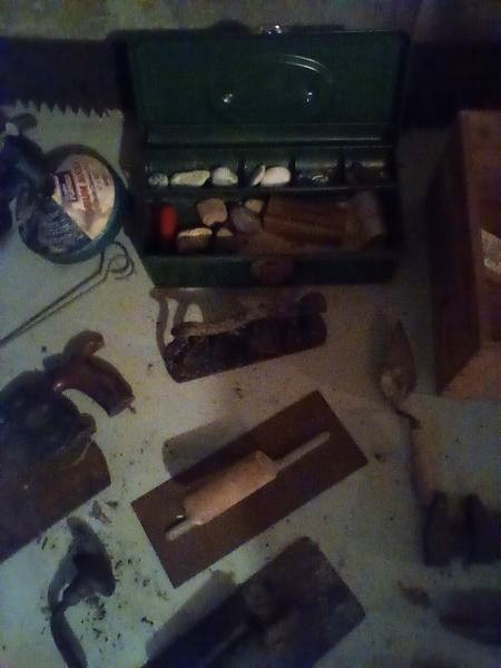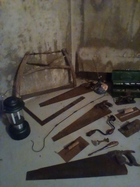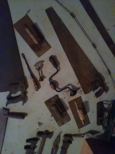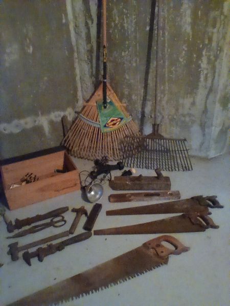 Antique Farm and Hand Tools. Includingseveral saws; hand tools; wrenches trowels; rakes; wood plane; glass door know; tool box & more. See photos. Loc in basement.