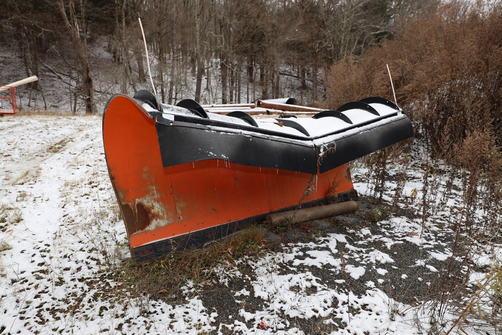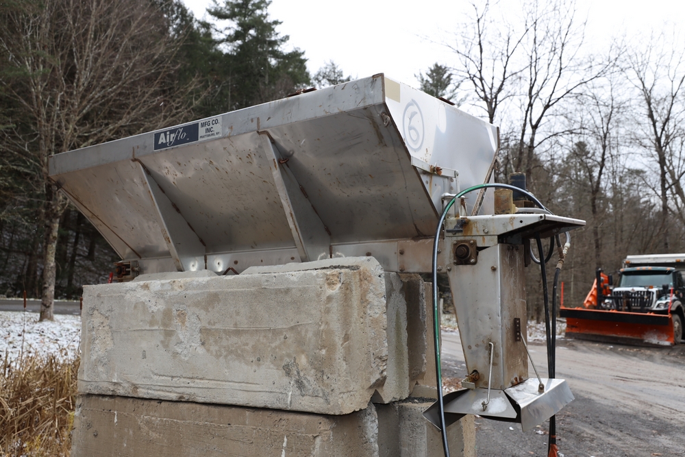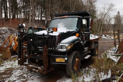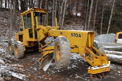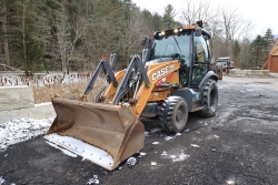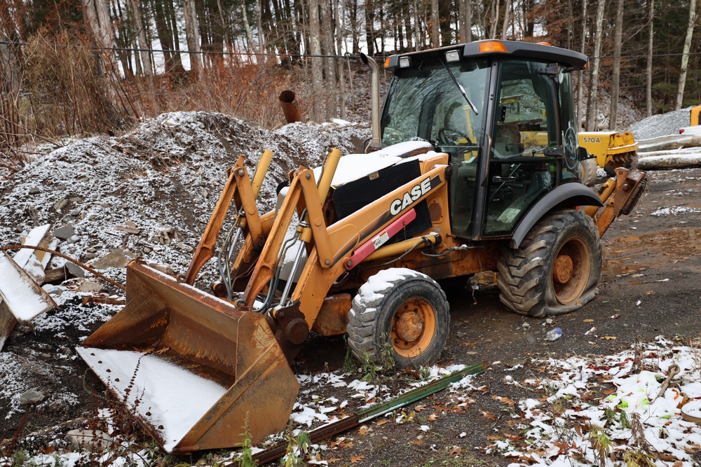 Items include 2021 Case 580SN Backhoe Loader, 1982 John Deere 570A Grader, 2003 Case 580M Series 2 Backhoe Loader, 2003 International WorkStar 7500, 1978 John Deere 570A Grader, Tenco plow, and salt spreaders. Items are located in Arkville, NY.