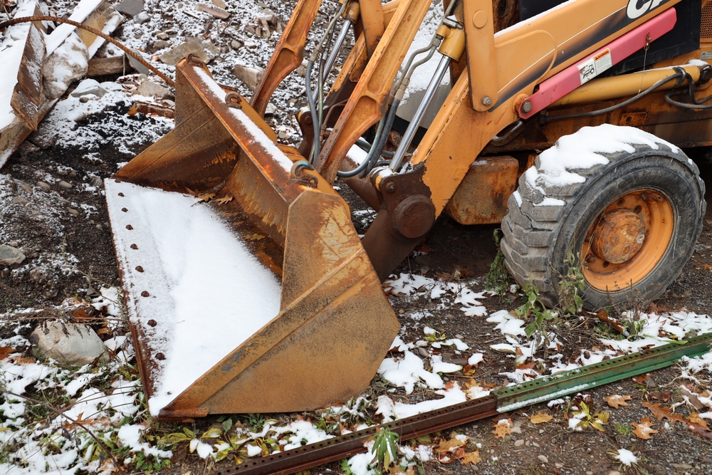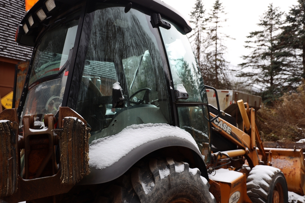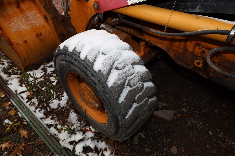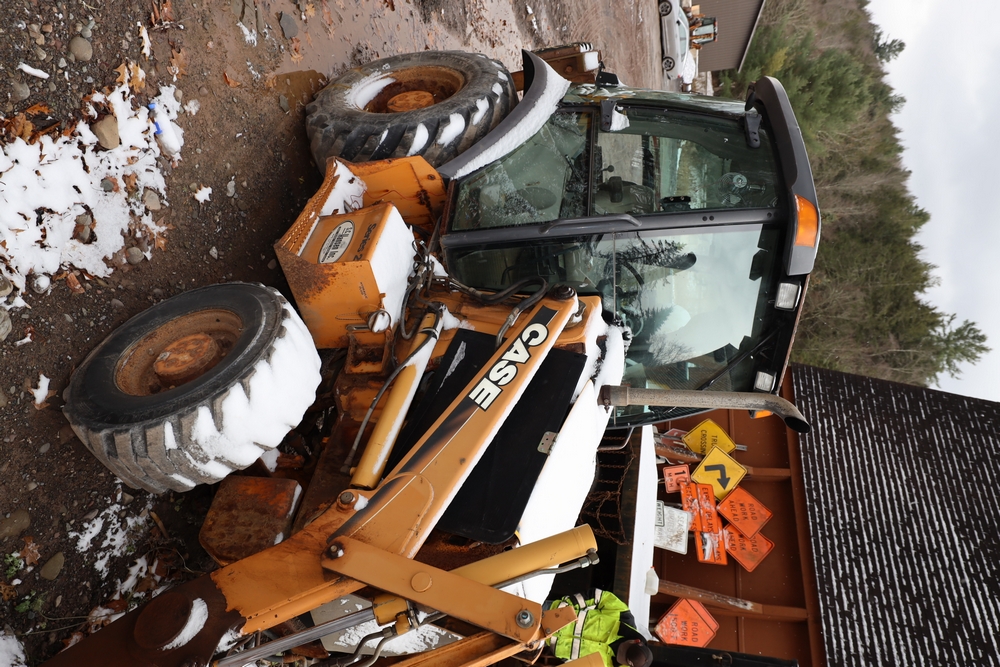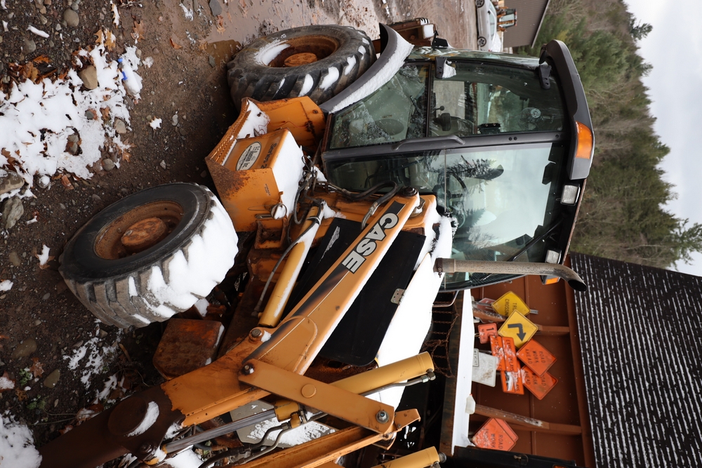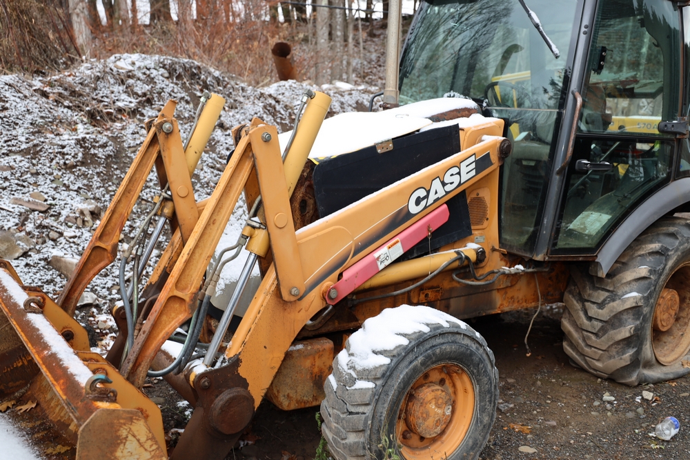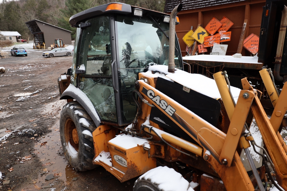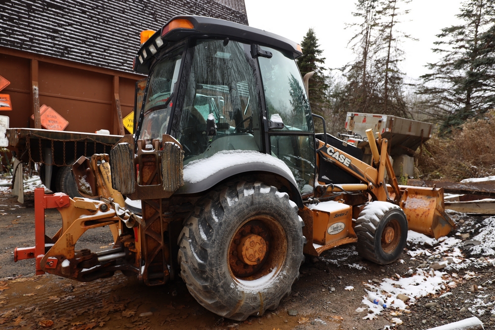 Items include 2021 Case 580SN Backhoe Loader, 1982 John Deere 570A Grader, 2003 Case 580M Series 2 Backhoe Loader, 2003 International WorkStar 7500, 1978 John Deere 570A Grader, Tenco plow, and salt spreaders. Items are located in Arkville, NY.