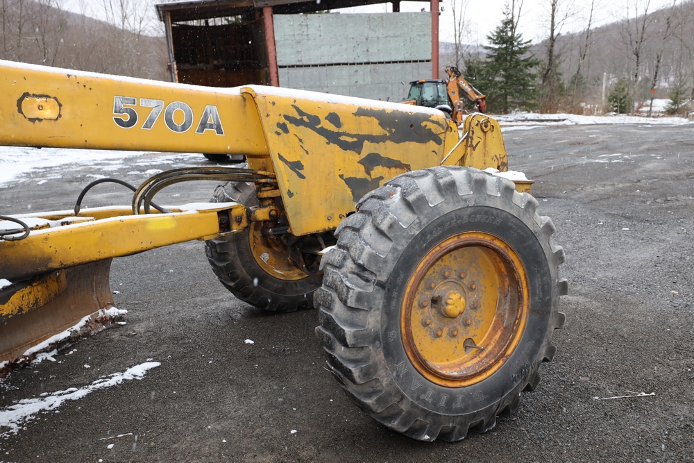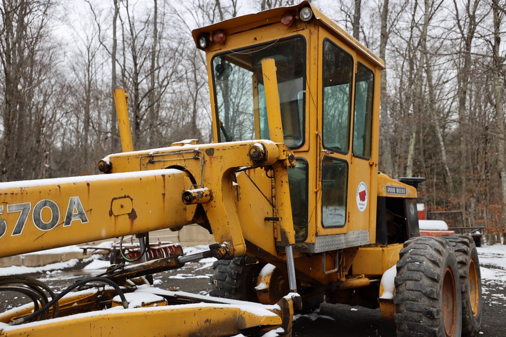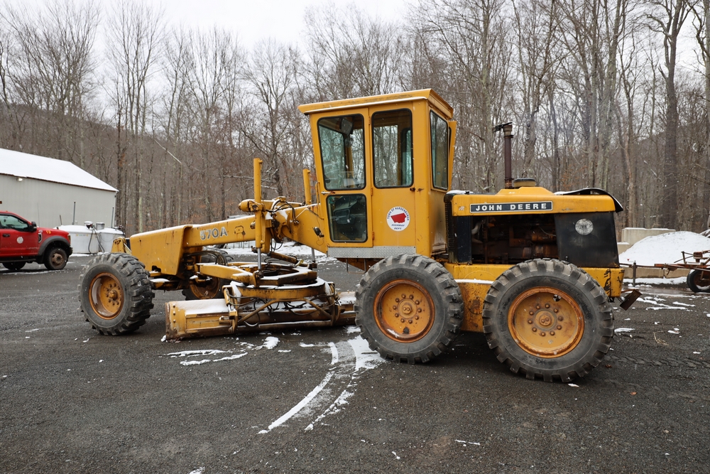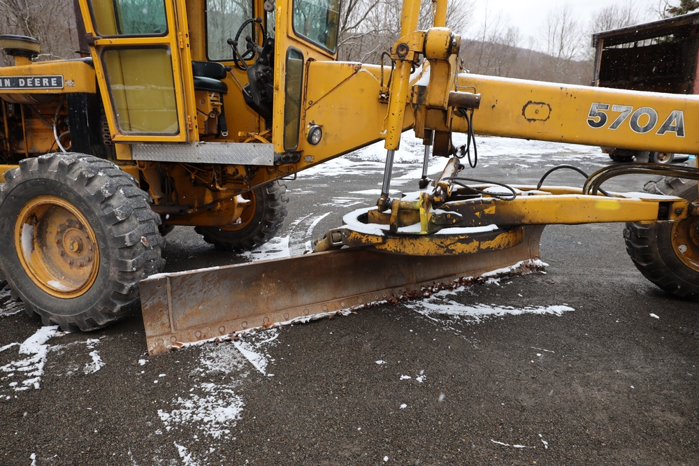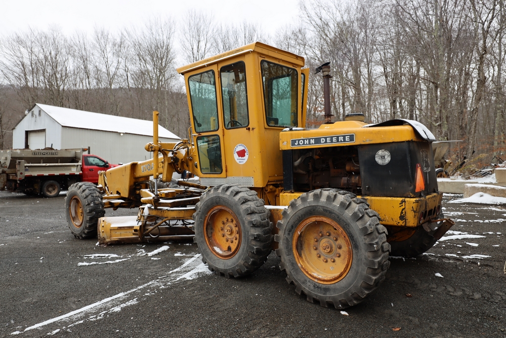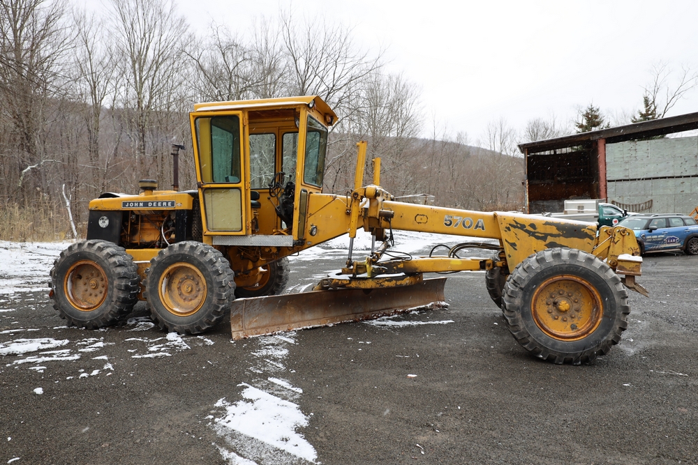 Items include 2021 Case 580SN Backhoe Loader, 1982 John Deere 570A Grader, 2003 Case 580M Series 2 Backhoe Loader, 2003 International WorkStar 7500, 1978 John Deere 570A Grader, Tenco plow, and salt spreaders. Items are located in Arkville, NY.