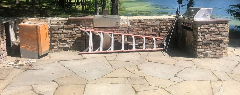 Outdoor kitchen consisting of multiple island bases with stone-veneer exteriors, matching stone countertop sections, and a stainless-steel U-Line freezer (model U-BI1215SOD-00A). The bases are designed to accommodate built-in components such as grills, refrigerators, or sink modules. Also included are stainless-steel food-prep and service units with integrated compartments and a faucet assembly. The first photo is provided for reference only; all other photos show the items included in the lot. Assistance will be available to load onto an appropriate vehicle/trailer. Freezer in unknown condition.