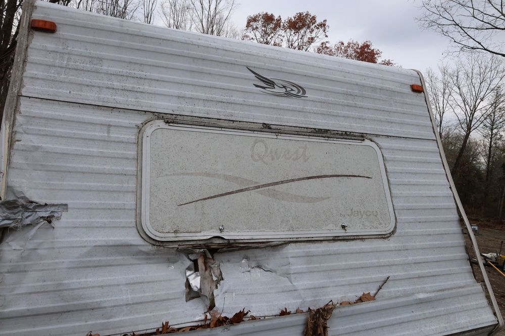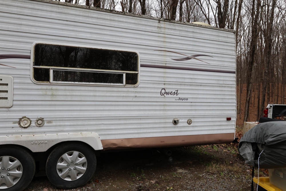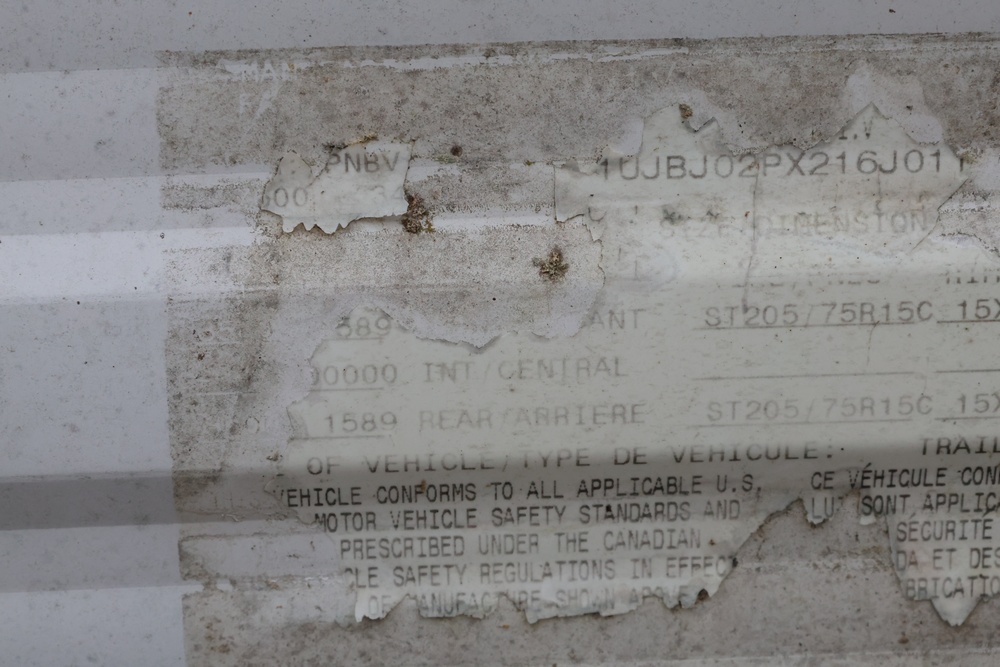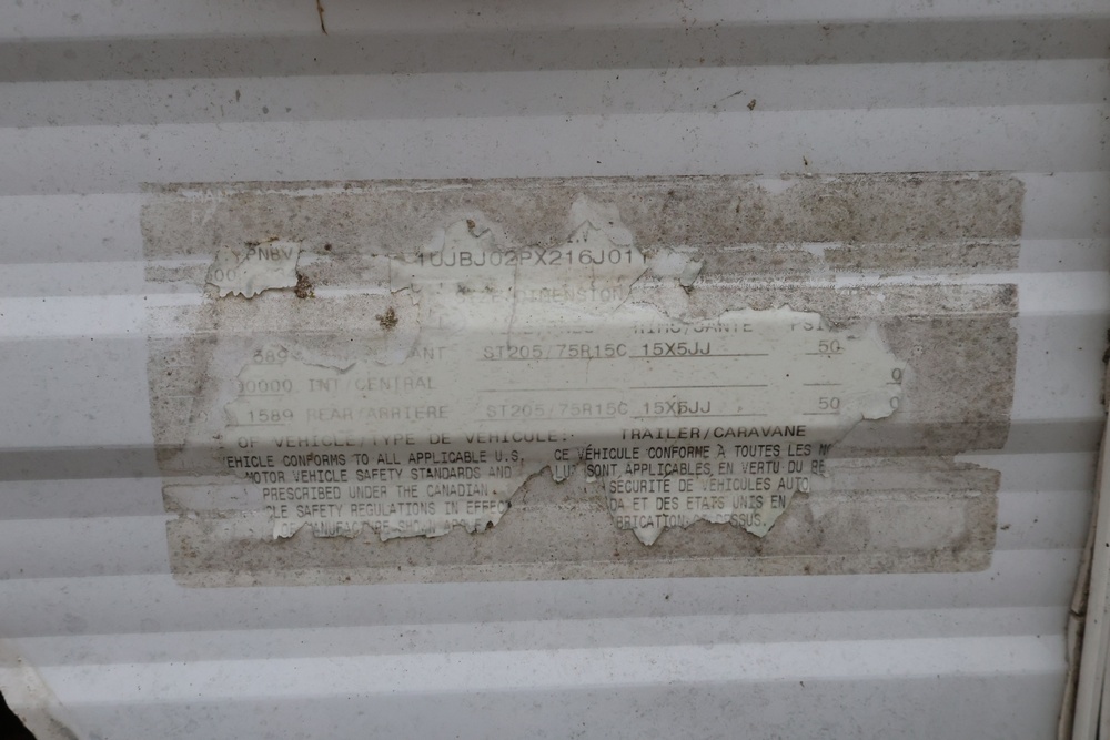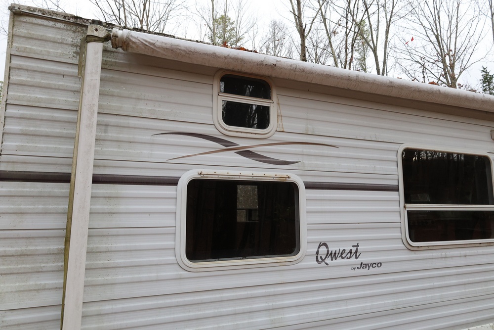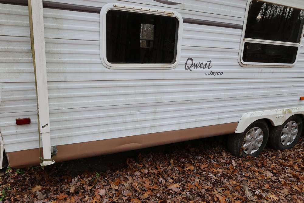 Believed to be a 2002 Jayco Qwest travel trailer. VIN appears to read: 1UJBJ02PX216J0114. Tandem-axle bumper-pull configuration with steel A-frame tongue, 2-5/16" coupler, dual battery trays, and front stabilizer jack broken. Exterior features include aluminum siding, side entry door, rooftop A/C unit, and multiple utility hook-ups. Interior layout includes a front bedroom with built-in cabinets, center kitchen with microwave, 3-burner stove and oven, refrigerator, and rear living/dining area with sofa and dinette. Bill of sale only. For parts only, trailer hitch latch is bent and non functional, buyer will need to be prepared to secure the trailer for transport.
