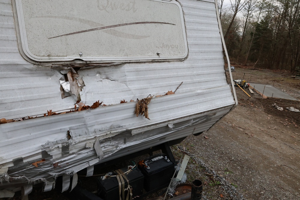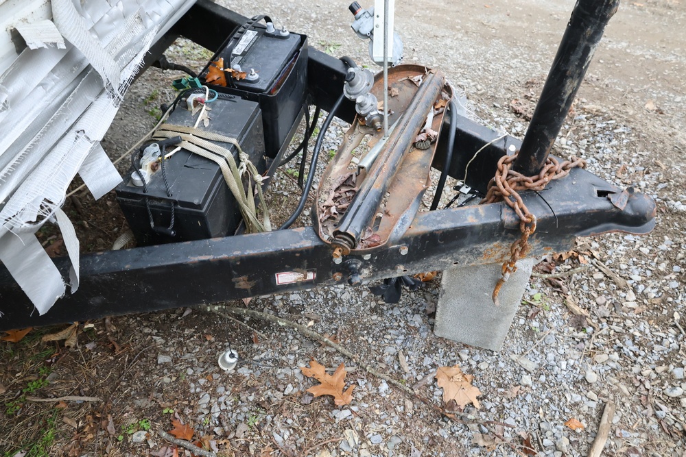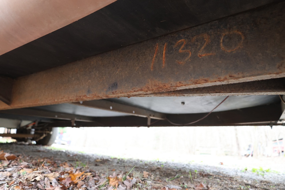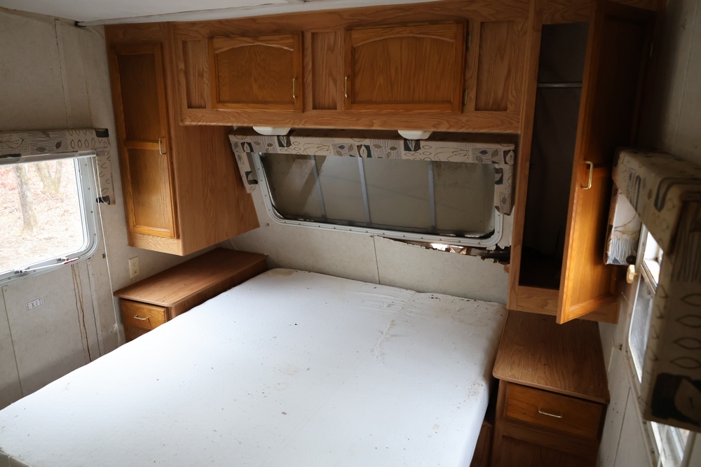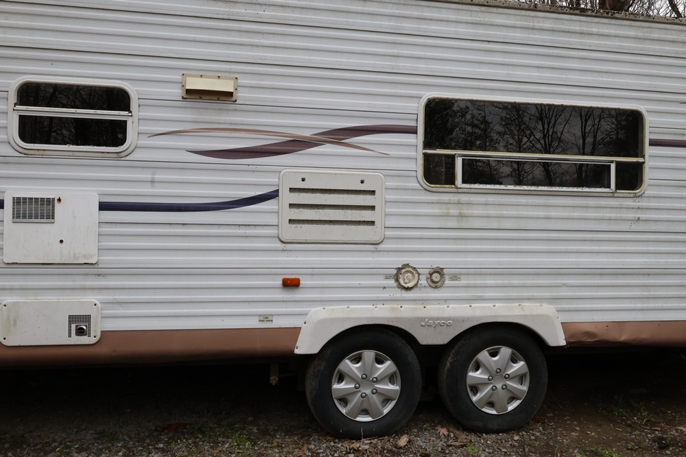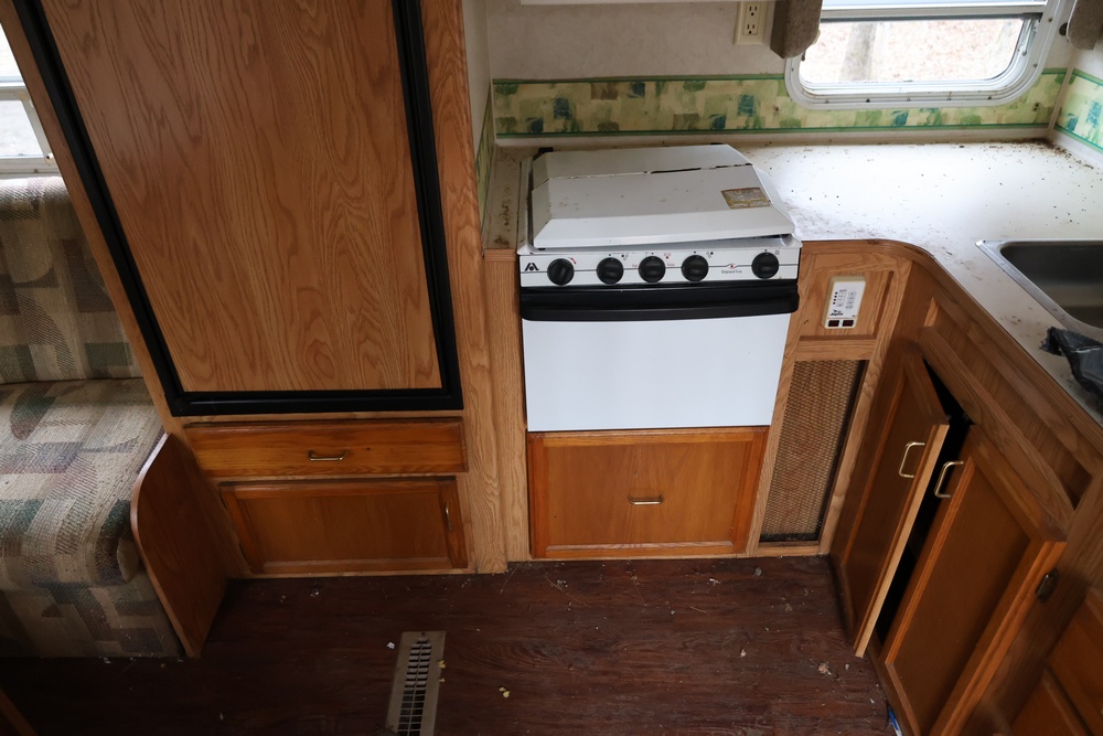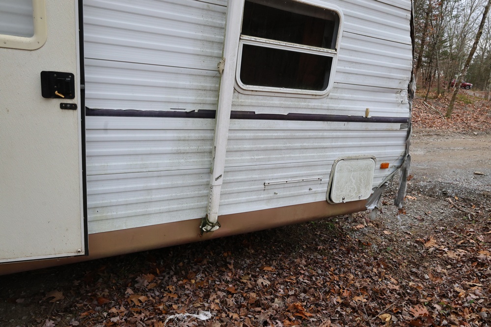 Believed to be a 2002 Jayco Qwest travel trailer. VIN appears to read: 1UJBJ02PX216J0114. Tandem-axle bumper-pull configuration with steel A-frame tongue, 2-5/16" coupler, dual battery trays, and front stabilizer jack broken. Exterior features include aluminum siding, side entry door, rooftop A/C unit, and multiple utility hook-ups. Interior layout includes a front bedroom with built-in cabinets, center kitchen with microwave, 3-burner stove and oven, refrigerator, and rear living/dining area with sofa and dinette. Bill of sale only. For parts only, trailer hitch latch is bent and non functional, buyer will need to be prepared to secure the trailer for transport.