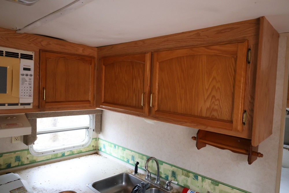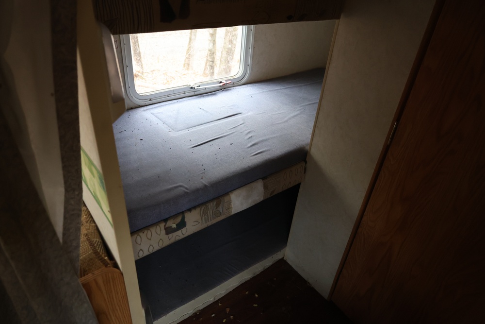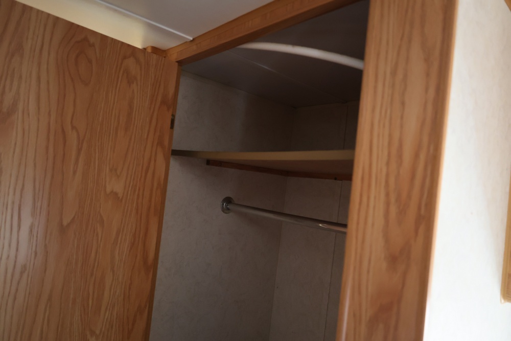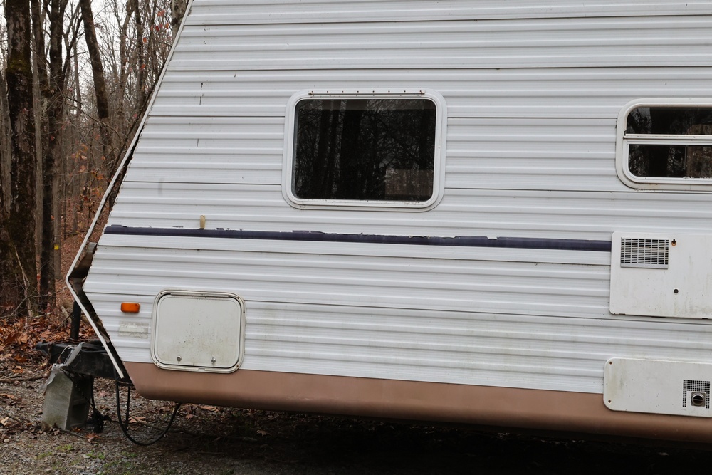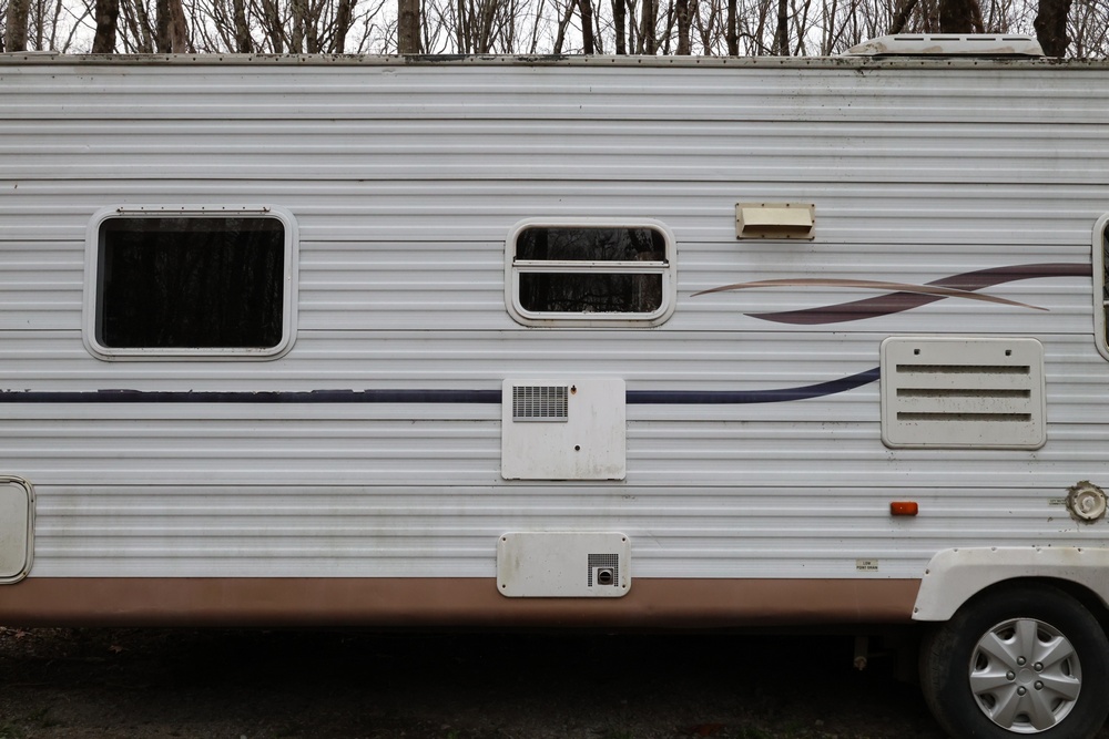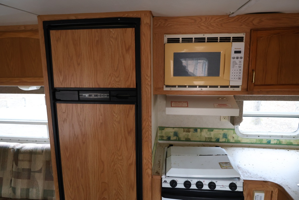 Believed to be a 2002 Jayco Qwest travel trailer. VIN appears to read: 1UJBJ02PX216J0114. Tandem-axle bumper-pull configuration with steel A-frame tongue, 2-5/16" coupler, dual battery trays, and front stabilizer jack broken. Exterior features include aluminum siding, side entry door, rooftop A/C unit, and multiple utility hook-ups. Interior layout includes a front bedroom with built-in cabinets, center kitchen with microwave, 3-burner stove and oven, refrigerator, and rear living/dining area with sofa and dinette. Bill of sale only. For parts only, trailer hitch latch is bent and non functional, buyer will need to be prepared to secure the trailer for transport.