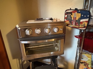 Kitchen Counter Appliances and Cookware, featuring Cuisinart. Over one-dozen items: Cuisinart electric griddle (in box); popcorn makers; slicer/shredder; blender; set of three red cast iron pans with lids; air fryer oven; stir-fry pan (in box); more. See photos. Shelves not incl.