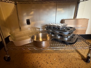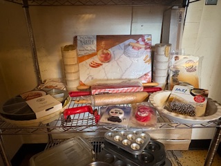 Bakeware. Assorted size baking pans for pies, loaf, muffins, cakes (metal and ceramic with lids); food chopper; measuring cups (assorted sizes); marble baking stone (in box); crocks; more. See photos. Shelves not incl.