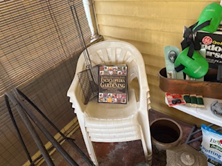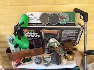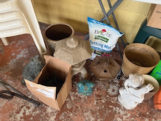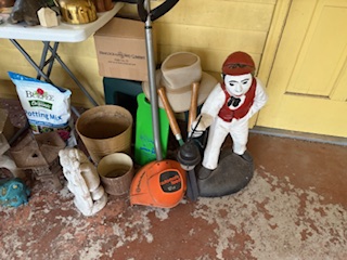 Lawn and Garden Décor, Log Holder. set of four stacking outdoor armchairs; large round log holder, 40"diam x21"Dx42"H; lawn statues; planters; small folding table (indoor use); indoor nursery (boxed); edge trimmer; copper planter & watering cans; more. See photos.