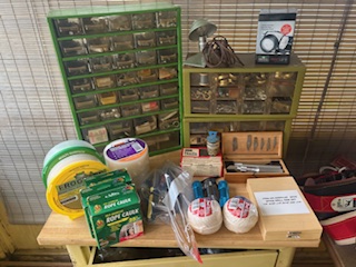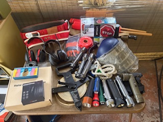 Functional Household, Table, Cabinet. Assort HW in caddies; many flashlights; headphones; cab with drawer & storage, 2'Wx18"Dx3'H; functional table. See photos for details.