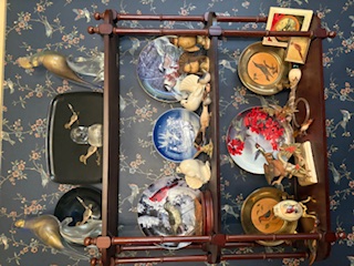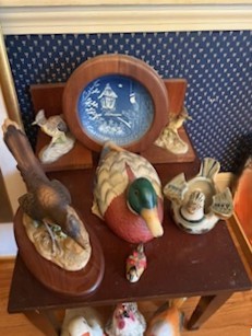 Wall Shelf, art, Décor. Bird-themed décor incl: collector's plates; statues; decoys; bookends; wood open wall shelf; wall art, approx. 1'Wx30"H; small wood table.