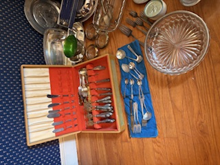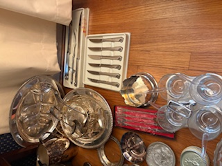 Silverplate Entertaining. vintage silverplate ent incl: flatware set in box; platters; bowls; pitcher; covered casserole; gray boat with tray: coasters; glass items, incl: trays; condiment set; knife sets (in boxes). See photos.