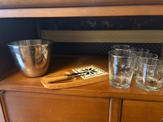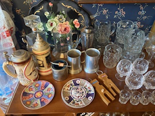 Bar Cabinet and Barware. German steins, incl "After the Hunt" #24/448 (see maker's mark); crystal & glass stemware & barware, incl beer mugs; plates; pheasant beverage glass set; ice bucket; cheese board with knife; two-drawer wood cab with storage, open shelf, drop sides, 58"W (open)x18"Dx33"H.