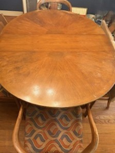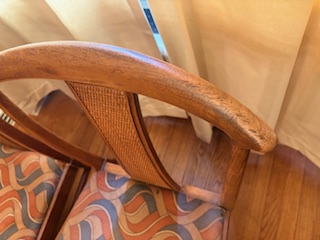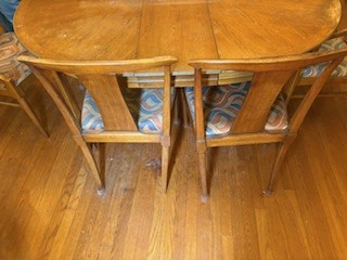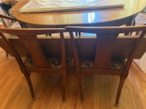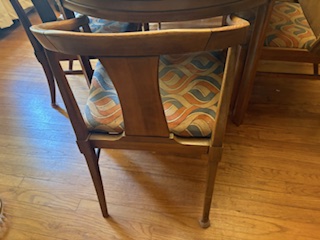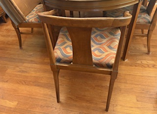 Mid-Century Thomasville Dining Set. Oval wood table, 5'Wx4'Dx38"H with beveled edge & one table insert, approx. 1'W; set of 6 chairs (4 side, 2 arm) with patterned seats. See damage to one chair. Items seen in background not incl.