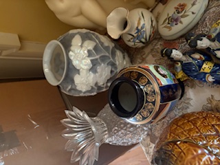 Vintage Décor and Foot Stool. Ceramic statue of three nudes; Asian décor; covered ceramic jar (pinecone-motif); vases (tallest 11"H); antique pitcher; covered dish; rush foot stool with wood legs; small table & covered opt. See photos.