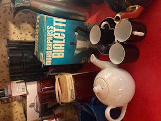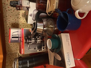 Coffee, Tea Pots and Accessories. Multiple coffee makers & pots (many in boxes); mugs; tea kettle; carafe; more. See photos for details.