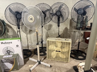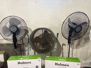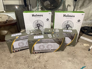 Floor, Box and Window Fans. Seven floor fans; two box fans; two Holmes fans (in boxes); three window fans; one vintage fan in wood casing.