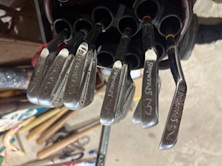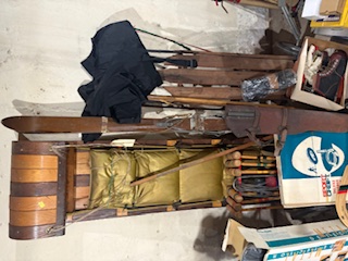 Outdoor Sports, featuring Toboggan. Spaulding and Wilson golf clubs in bags; vintage wood toboggan with padded seats, 6'L; vintage wood sled. See photos for details.