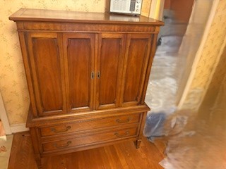 Dresser and Armoire. Nine-drawer dresser, 64"Wx20"Dx32"H with attached mirror, 47"Wx33:H; matching armoire chest, 40"Wx18"Dx52"H with int & exterior drawer storage.