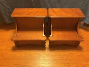 Mid-Century Modern Bed, Chest, Nightstand. MCM full-sized bed with matching chest (seen in lot #53) and nightstand, 22"X16"dx2'H; table lamp; pr wood steps. Optional mattress & bedding.