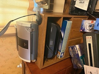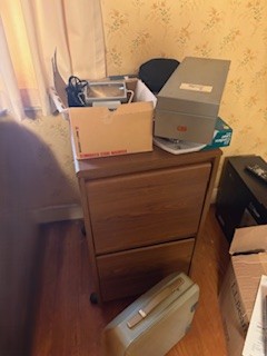 Office Furniture and Equipment. Two-drawer wood file cab on wheel; printer stand with shelves; assort office items and equipment, incl typewriters; Dell printer; much more! Dresser seen in photo incl in lot #48.