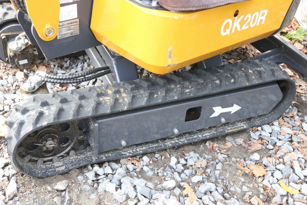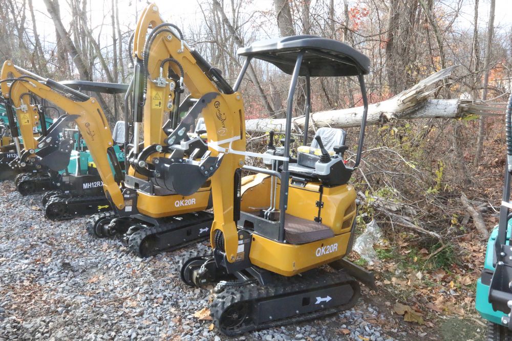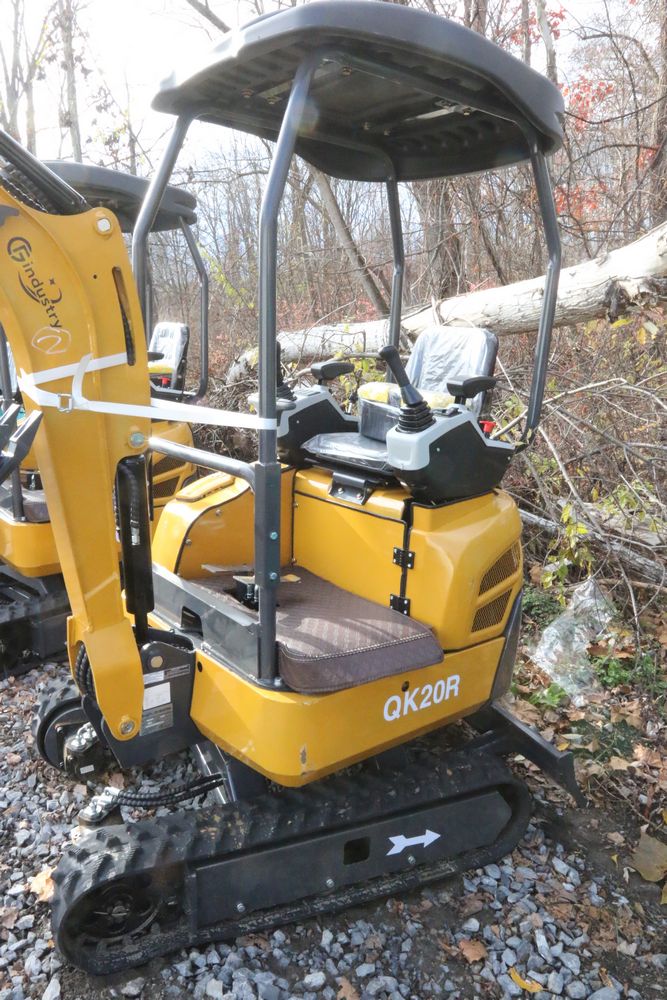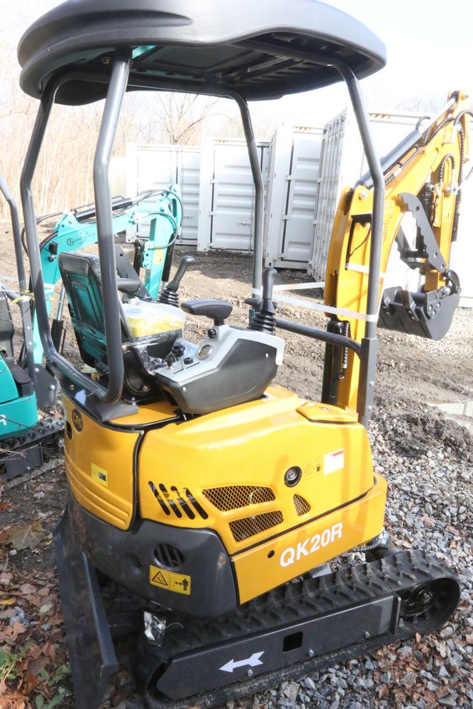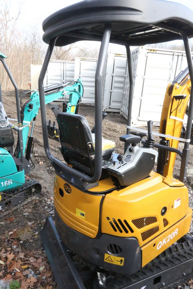 New 2025 CFG Industrial gas powered mini Excavator model QK20R with bucket, dozer blade, haydraulic thumb, aux hydraulics, RATO 23HP, and canopy cover. Hours reading less than 1 hour.