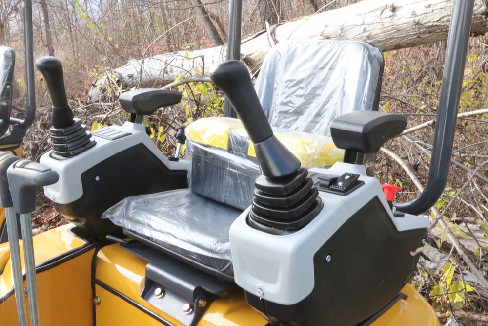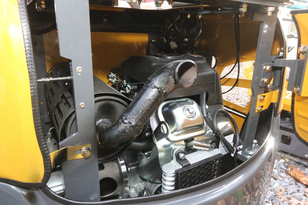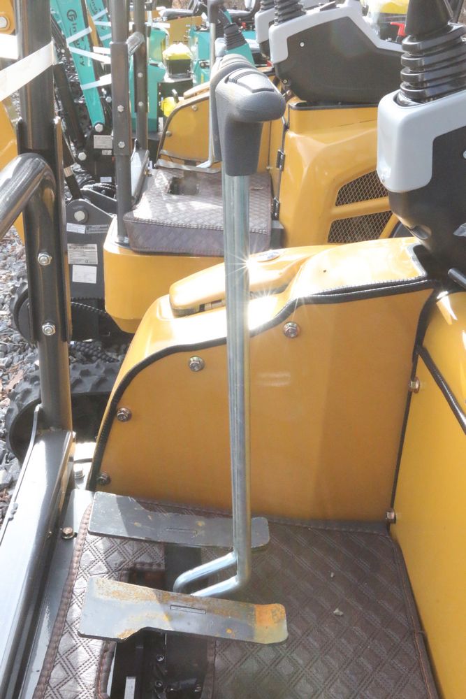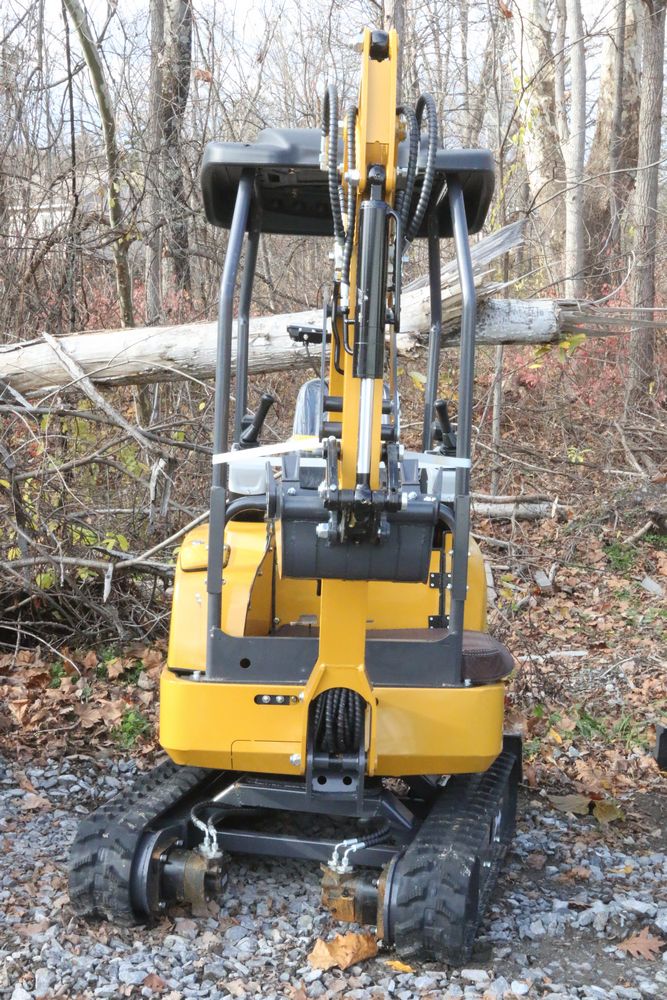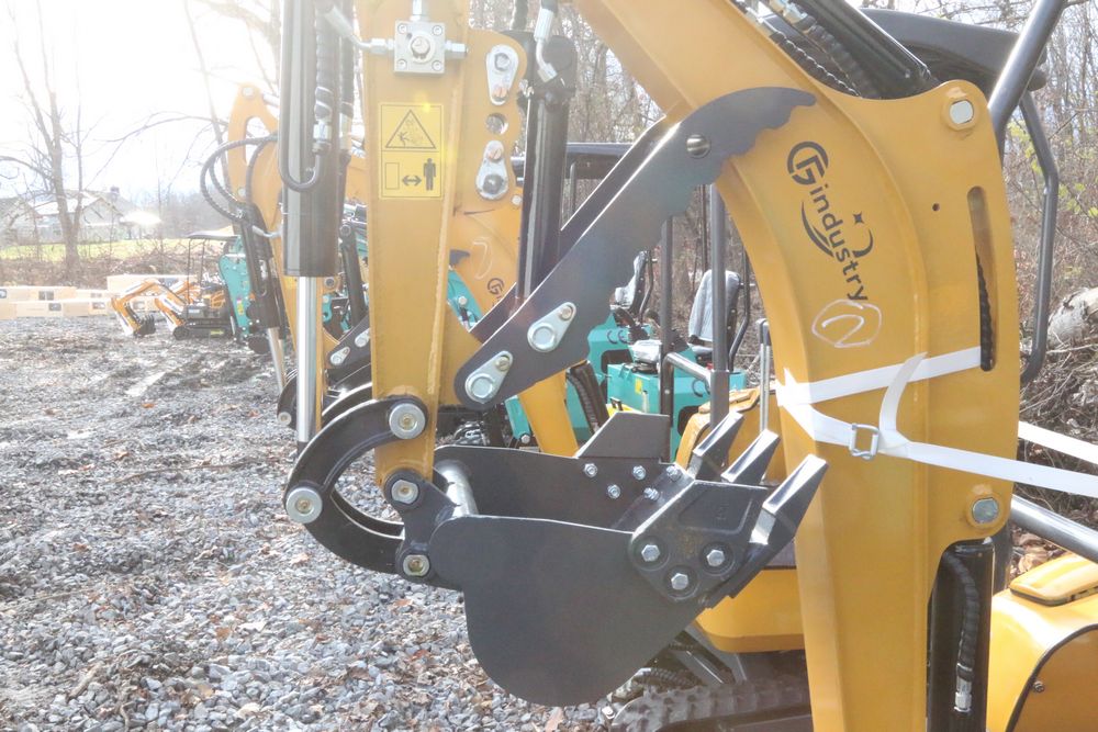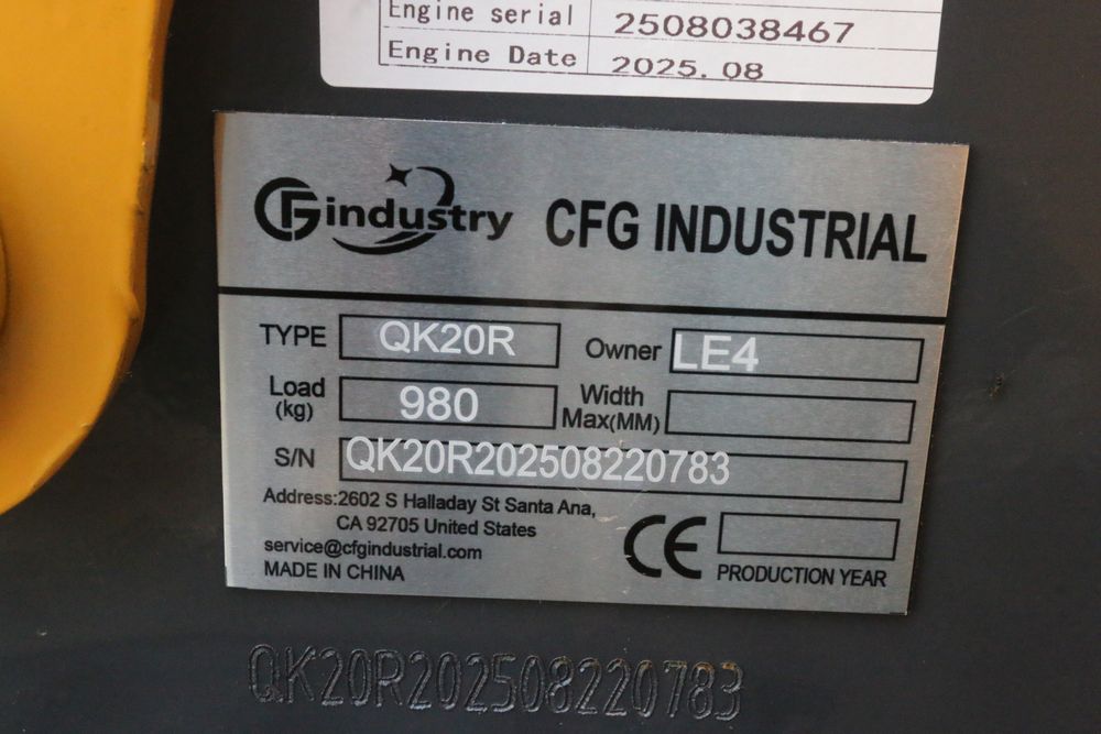New 2025 CFG Industrial gas powered mini Excavator model QK20R with bucket, dozer blade, haydraulic thumb, aux hydraulics, RATO 23HP, and canopy cover. Hours reading less than 1 hour.