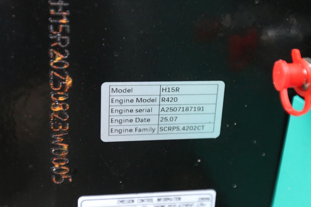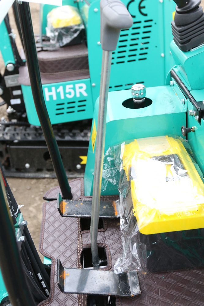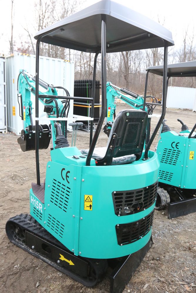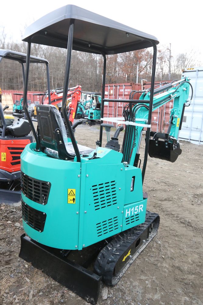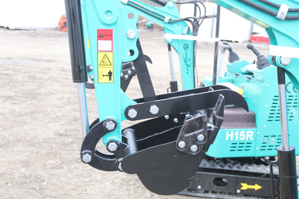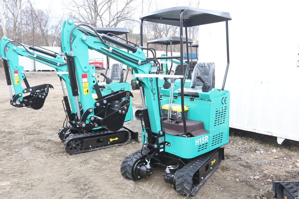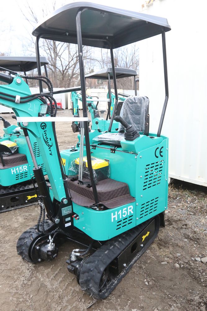 New 2025 CFG Industrial gas powered mini Excavator model H15R with 420cc gasoline engine, bucket, 4' long tracks, 38.5" wide base, 6" wide tracks, canopy, hydraulic boom & bucket controls, pilot system, thumb, dozer blade. Hours reading less than 1 hour.