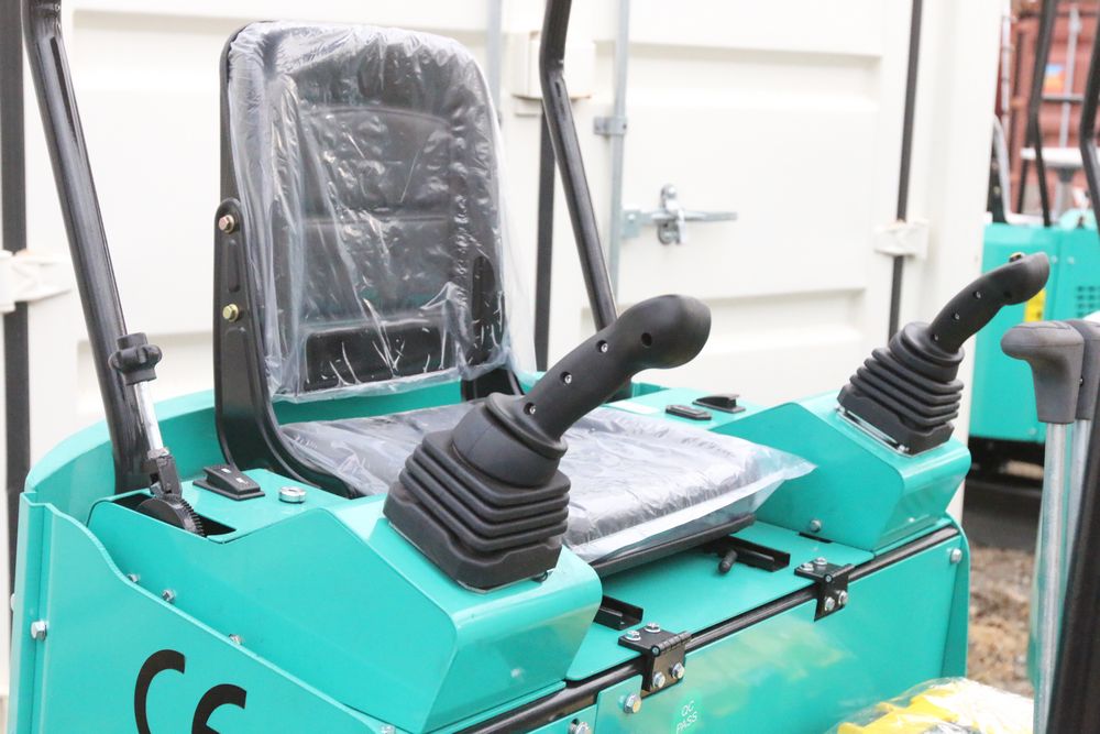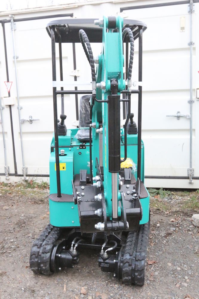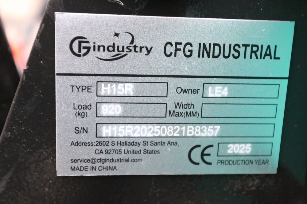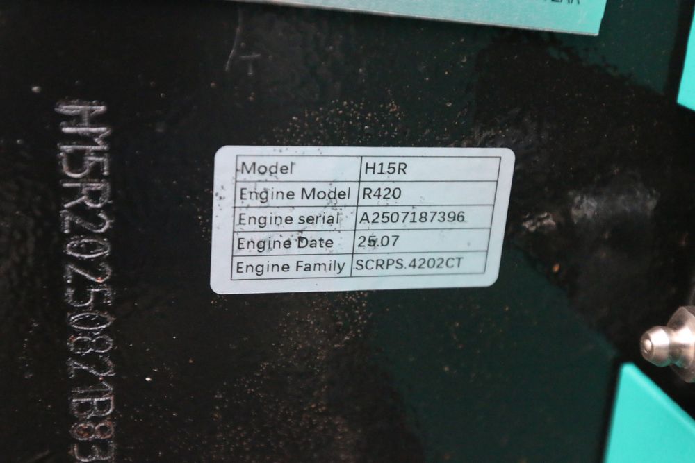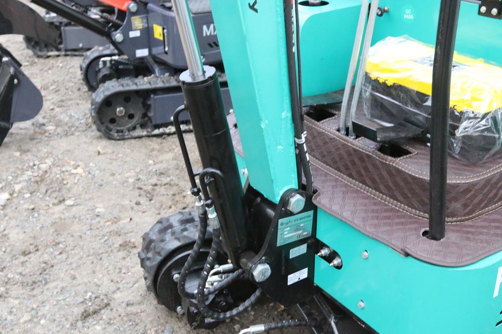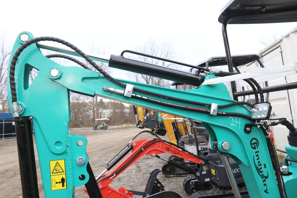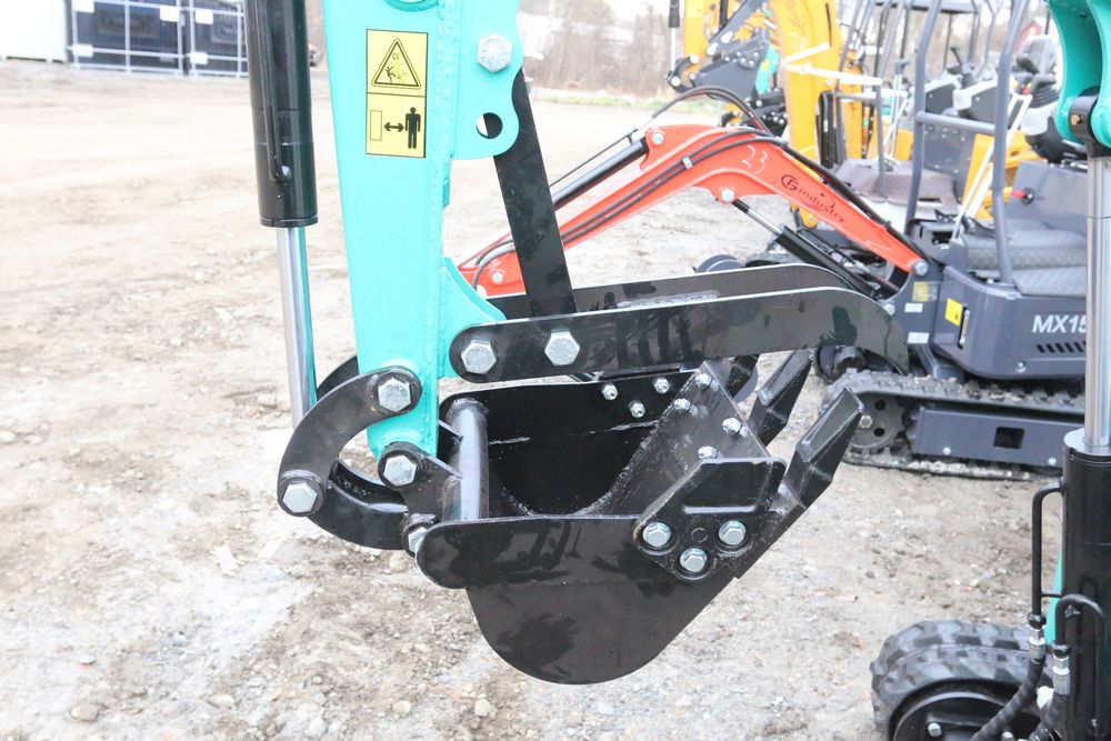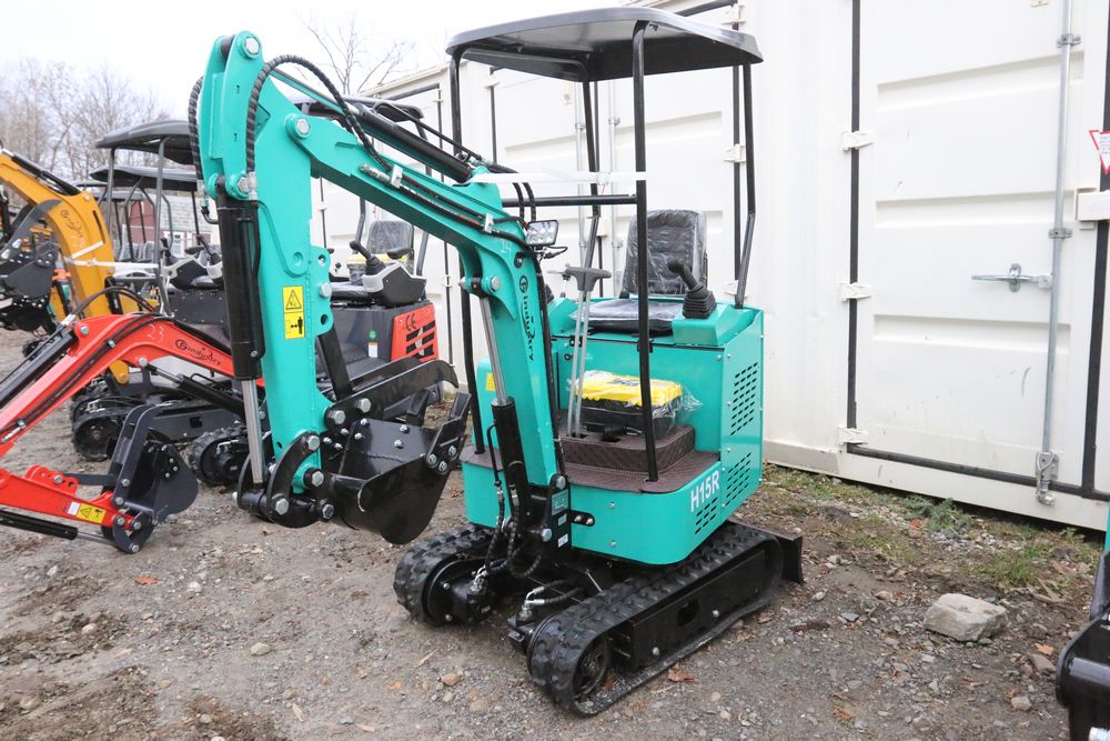 New 2025 CFG Industrial gas powered mini Excavator model H15R with 420cc gasoline engine, bucket, 4' long tracks, 38.5" wide base, 6" wide tracks, canopy, hydraulic boom & bucket controls, pilot system, thumb, dozer blade. Hours reading less than 1 hour.