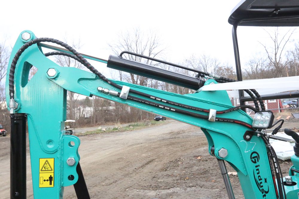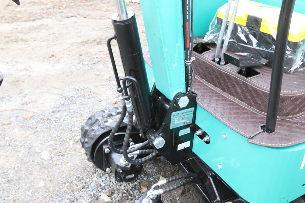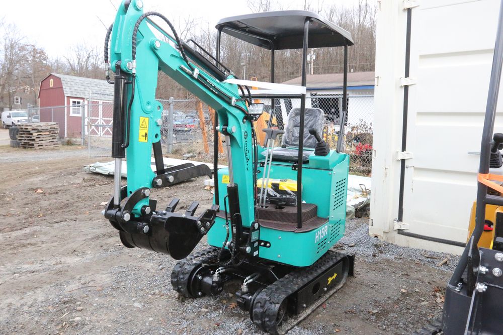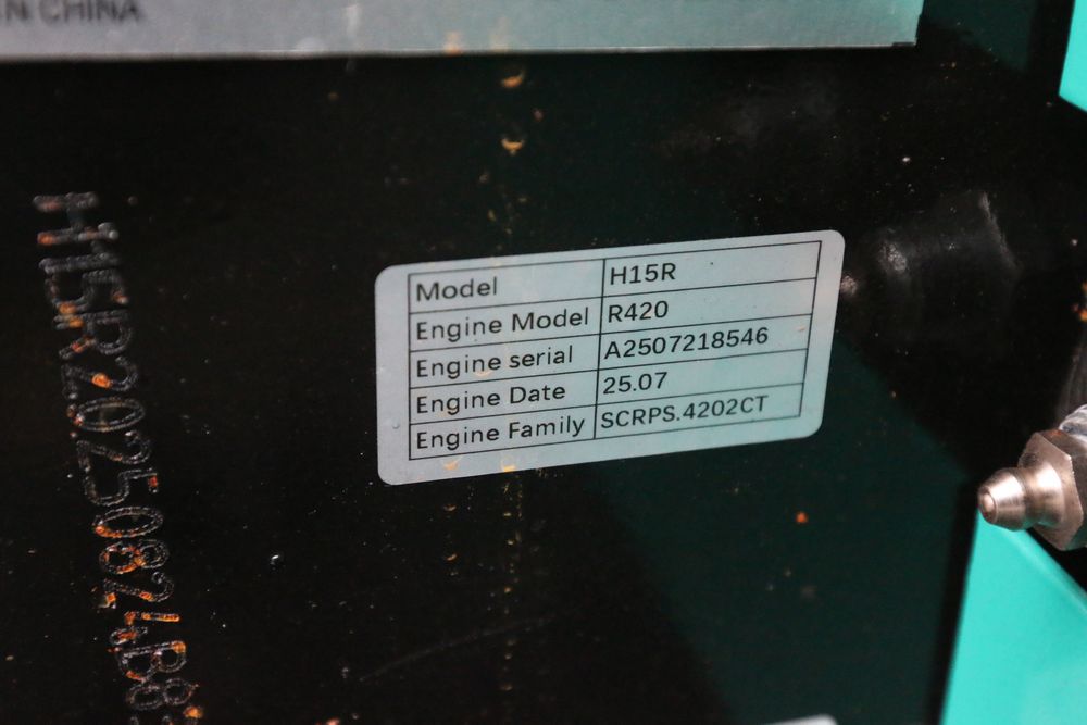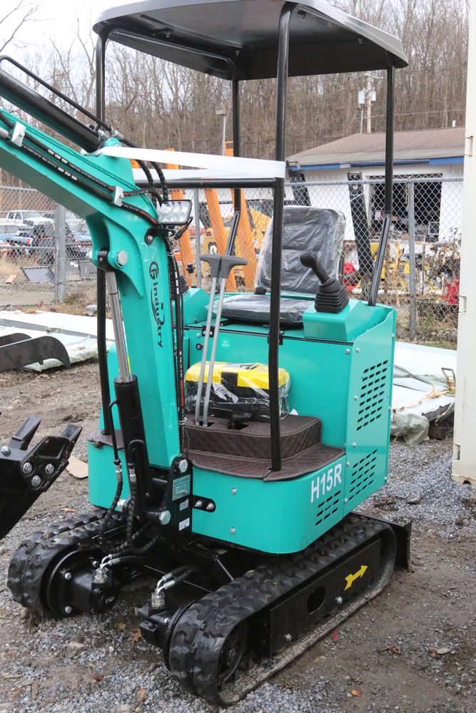 New 2025 CFG Industrial gas powered mini Excavator model H15R with 420cc gasoline engine, bucket, 4' long tracks, 38.5" wide base, 6" wide tracks, canopy, hydraulic boom & bucket controls, pilot system, thumb, dozer blade. Hours reading less than 1 hour.