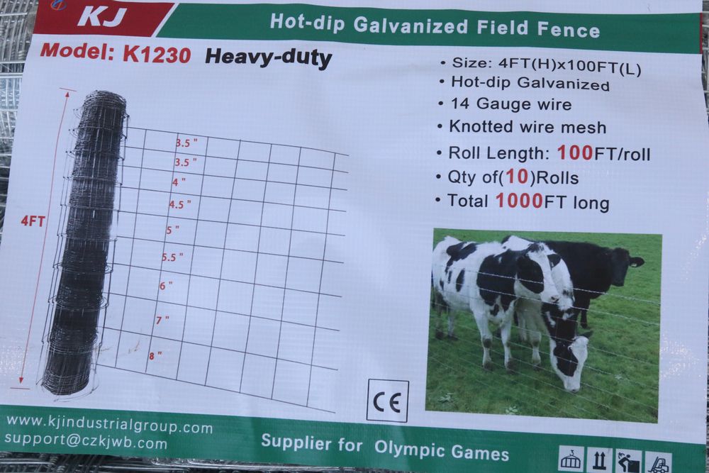 New 2025 KJ Hot-dip Galvanized field fence, 4'Tx100'L, 14 gauge wire, 100 feet/roll, 10 rolls total, model K1230.