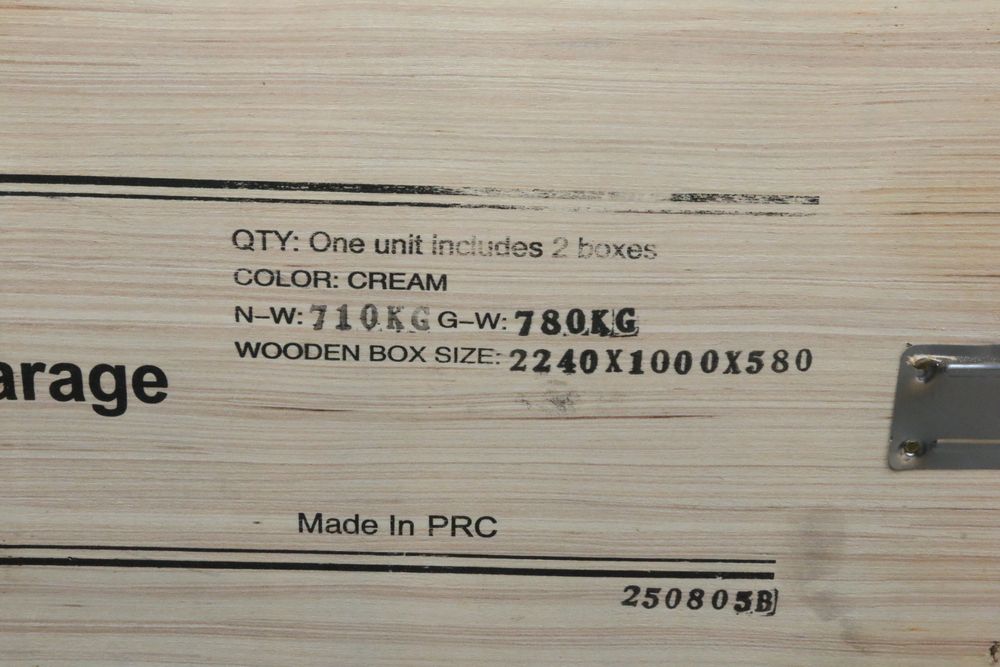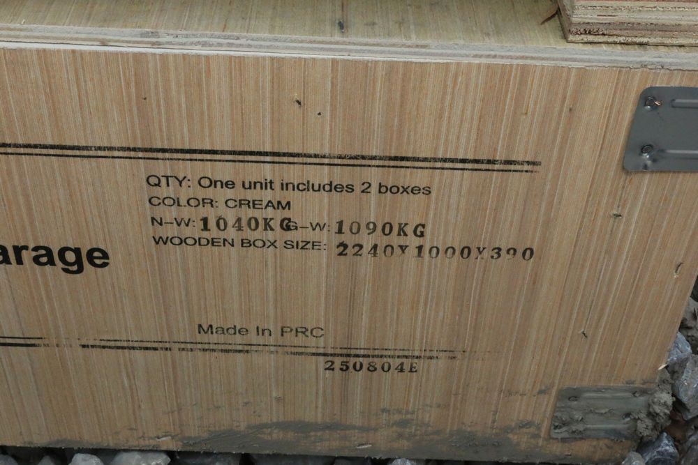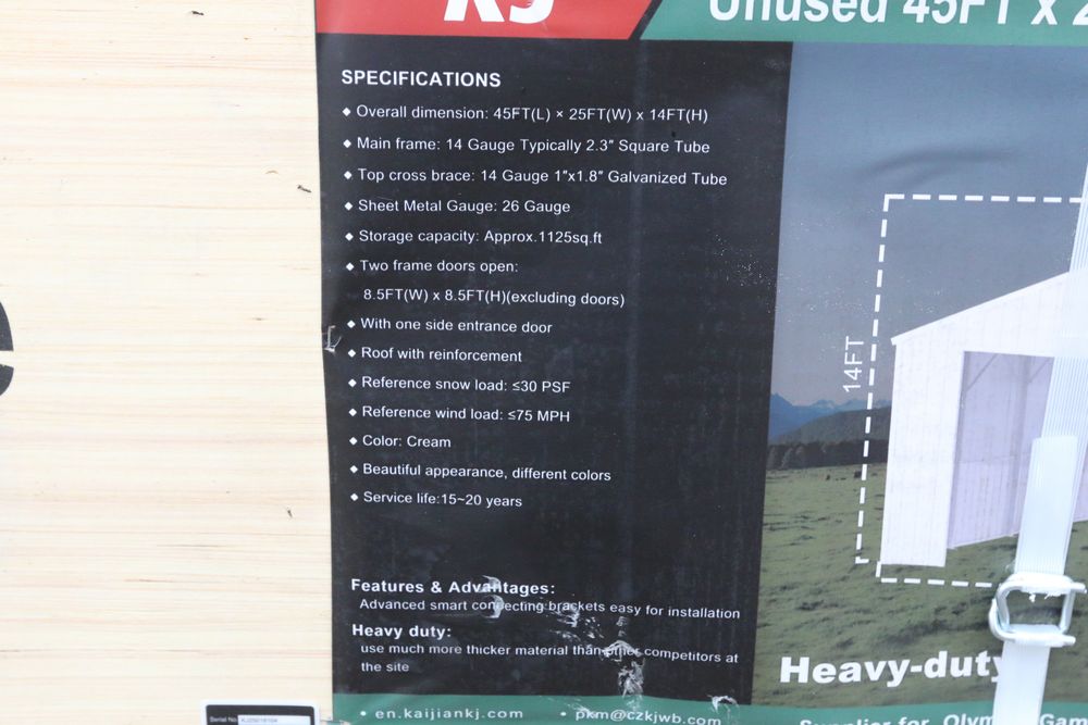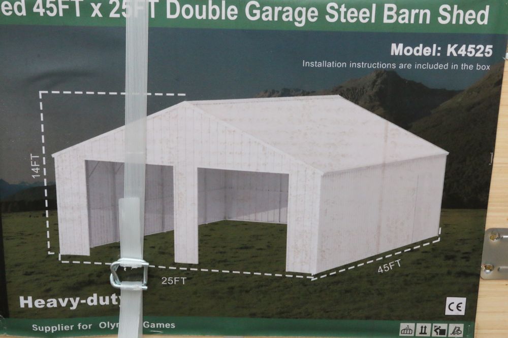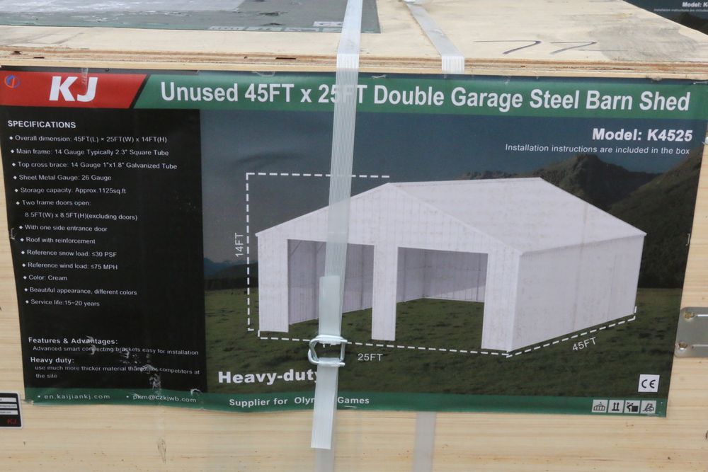 New KJ unused 45ft. x 25ft. double garage steel barn shed model K4525, in wood crate.