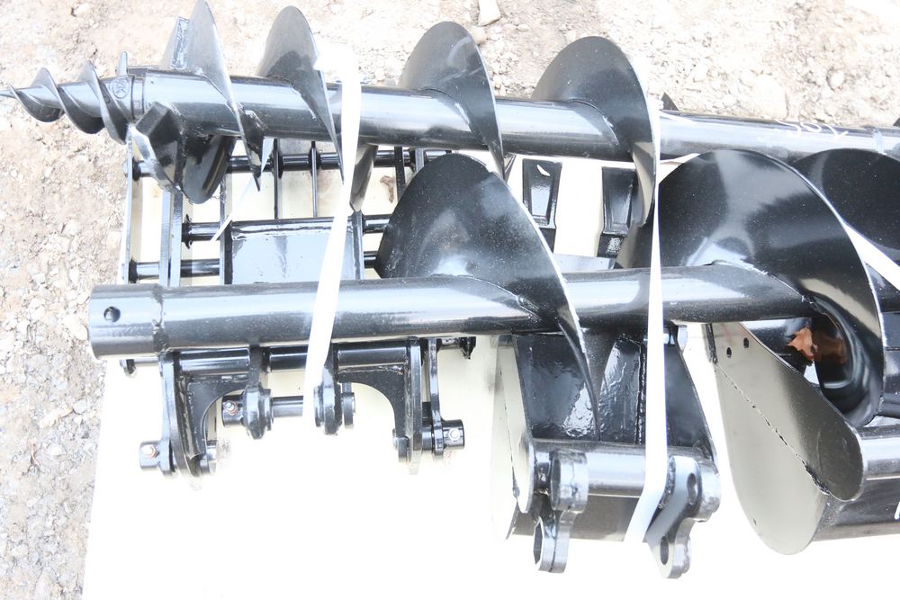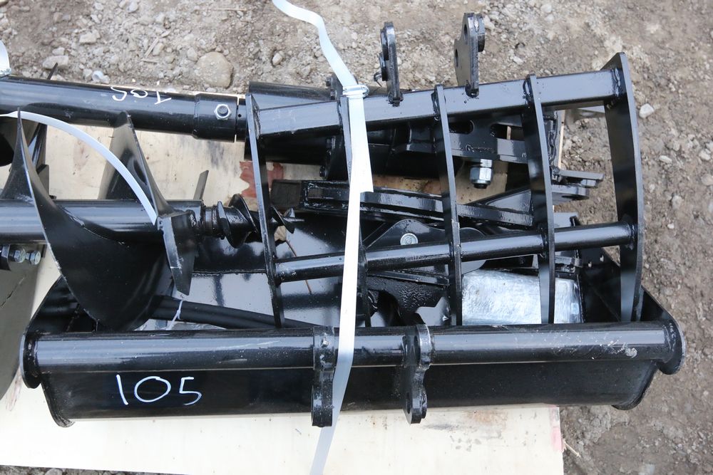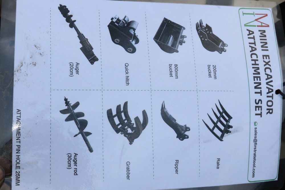 New MIVA 8pc mini excavator attachment set with 200mm bucket, 800mm bucket, quick hitch, 20cm auger, 30cm auger, rake, ripper, and grapple.