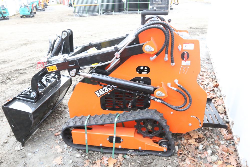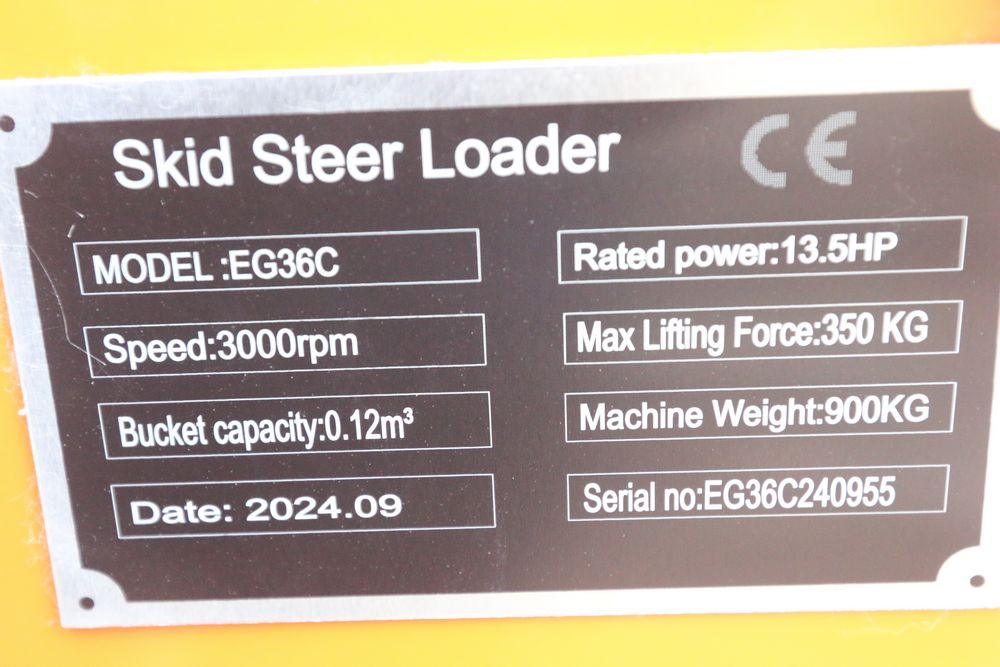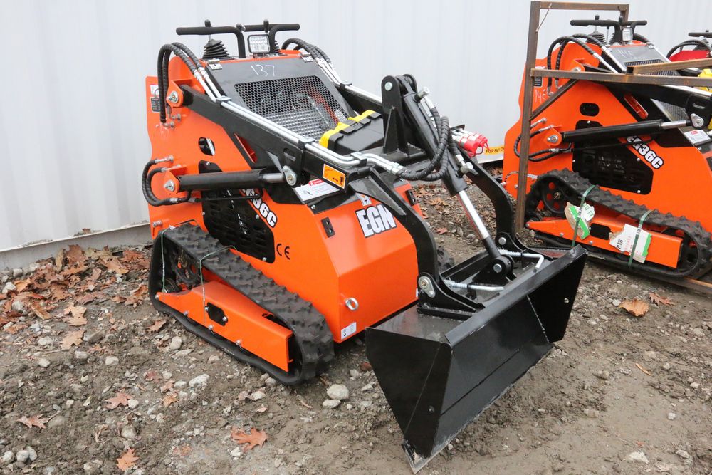 New EGN mini skid steer track loader model: EG36C, 13.5hp engine, bucket, hand controls, front facing lights, auxiliary hydraulics. Hours reading less then one hour.