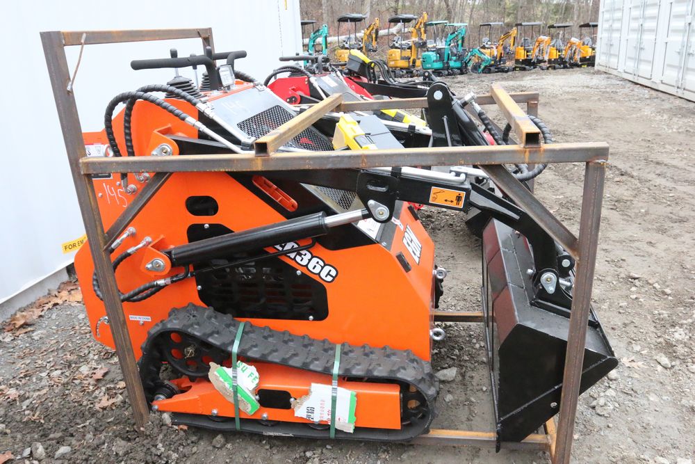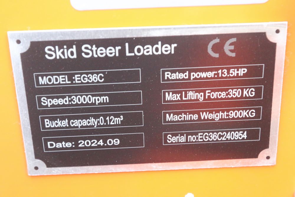 New EGN mini skid steer track loader model: EG36C, 13.5hp engine, bucket, hand controls, front facing lights, auxiliary hydraulics. Hours reading less then one hour.