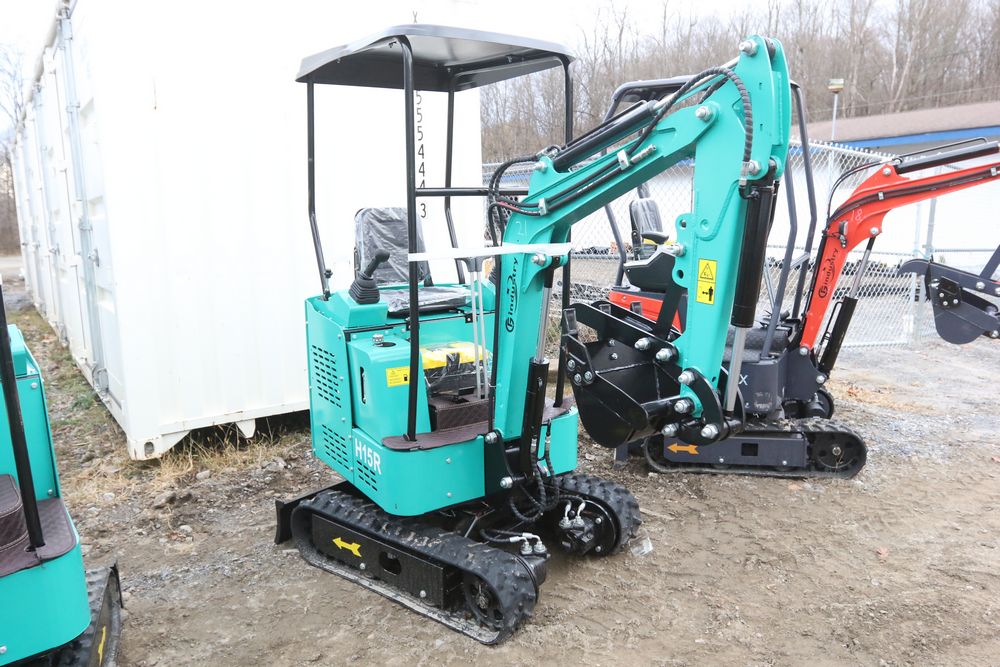 New 2025 CFG Industrial gas powered mini Excavator model H15R with 420cc gasoline engine, bucket, 4' long tracks, 38.5" wide base, 6" wide tracks, canopy, hydraulic boom & bucket controls, pilot system, thumb, dozer blade. Hours reading less than 1 hour.