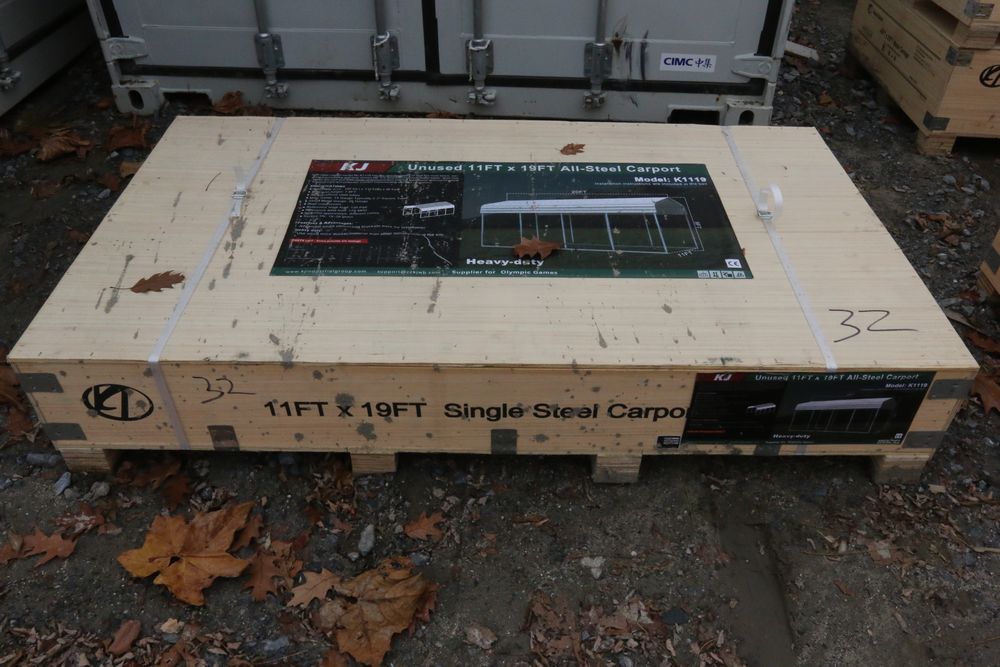 New KJ All-steel carport, 11'Wx20'Lx9'T, model K1119, in wood crate.