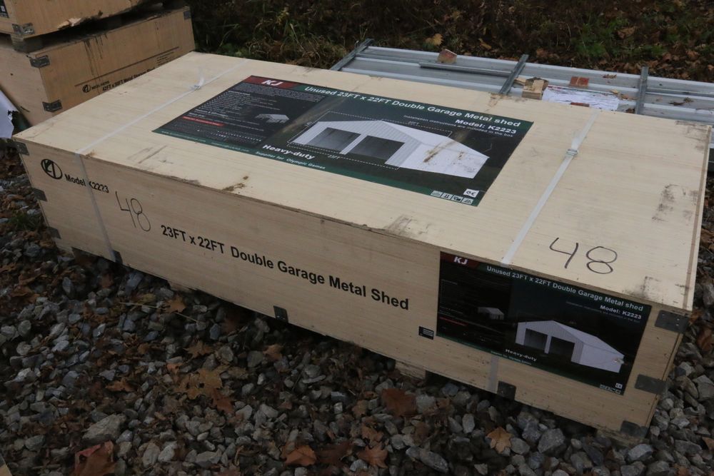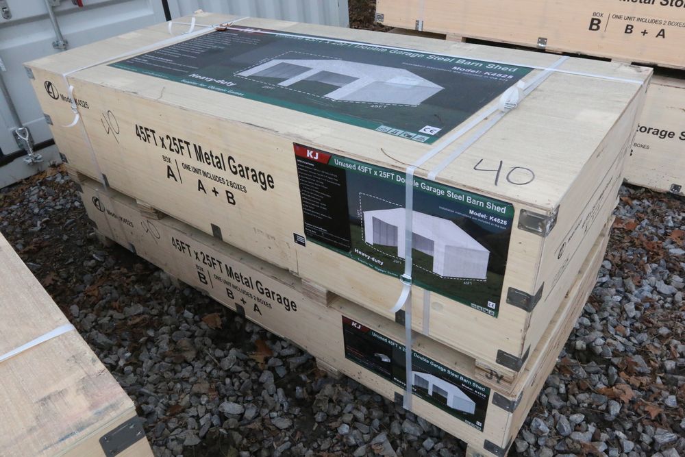 New KJ unused 45ft. x 25ft. double garage steel barn shed model K4525, in wood crate.
