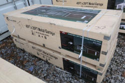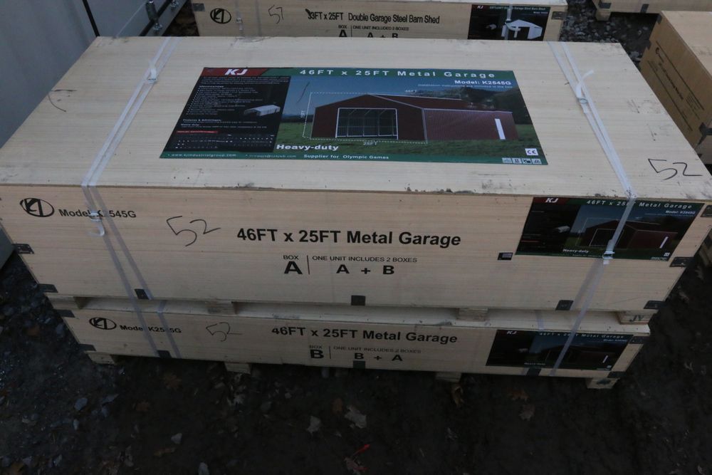 New KJ metal garage 46'Lx25'Wx15'H, model K2545G, in wood crate.