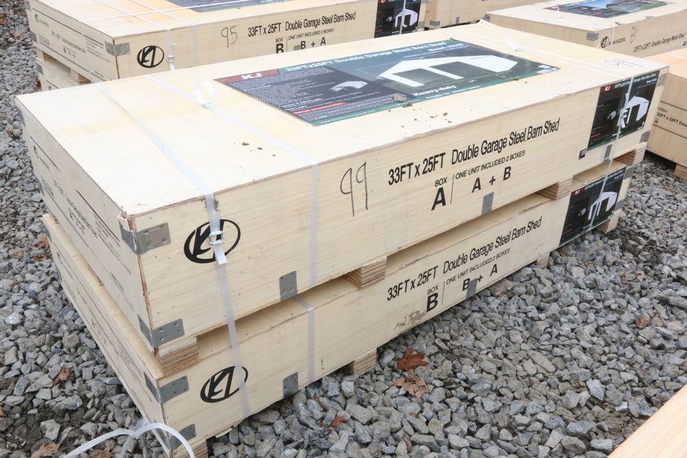 New KJ 33ftx25ft double garage steel barn shed in wood crate, model K3325.