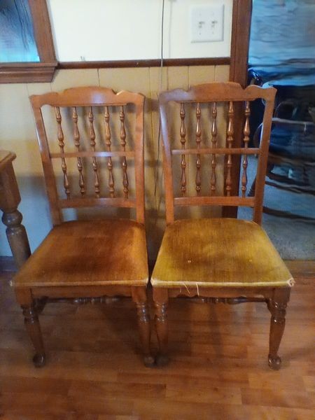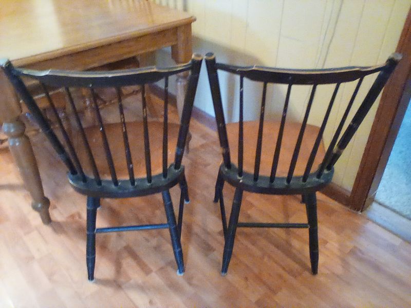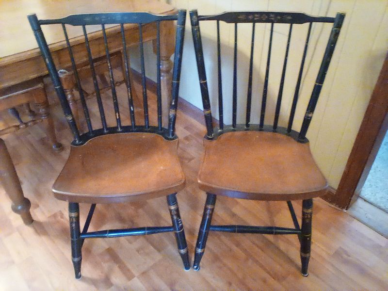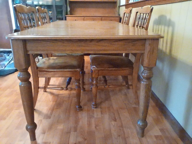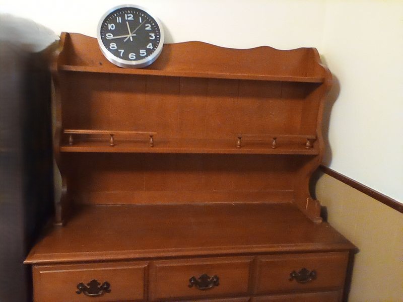 Maple Farm Table and Country Hutch. Maple oblong table (seats eight); coordinating open-style hutch with plate grooves; large dovetailed linen drawer & storage below; pair of stenciled Hitchcock chairs. See photos for condition of chairs and clean break in hutch (does not effect functionality).